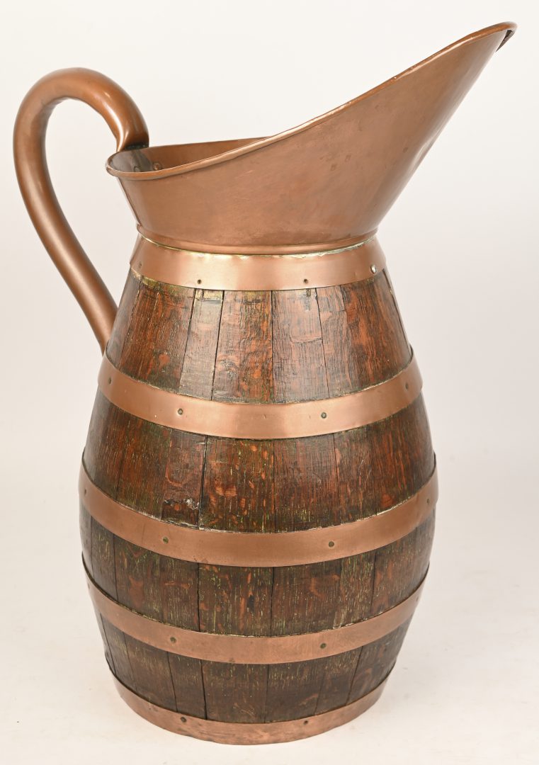 An old copper milk churn, dented. -