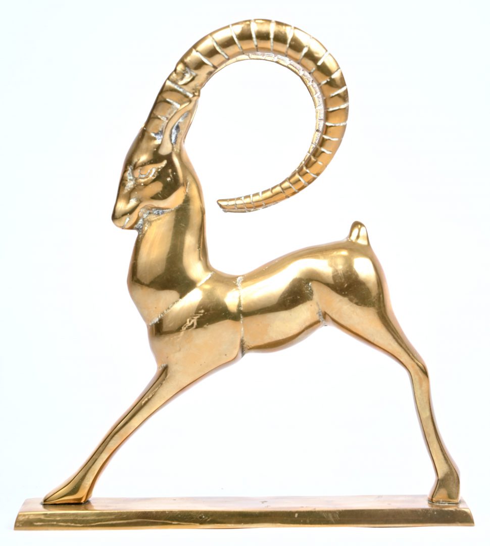 Een messing beeldje van een springbok, in Art Deco stijl.
