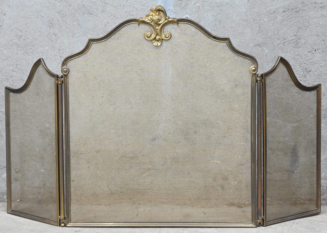 A brass triptych fireplace screen.
