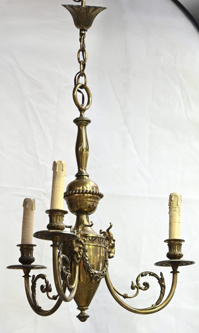Een messing luchter in Louis-XVI stijl, gedecoreerd met guirlandes en ramskoppen.