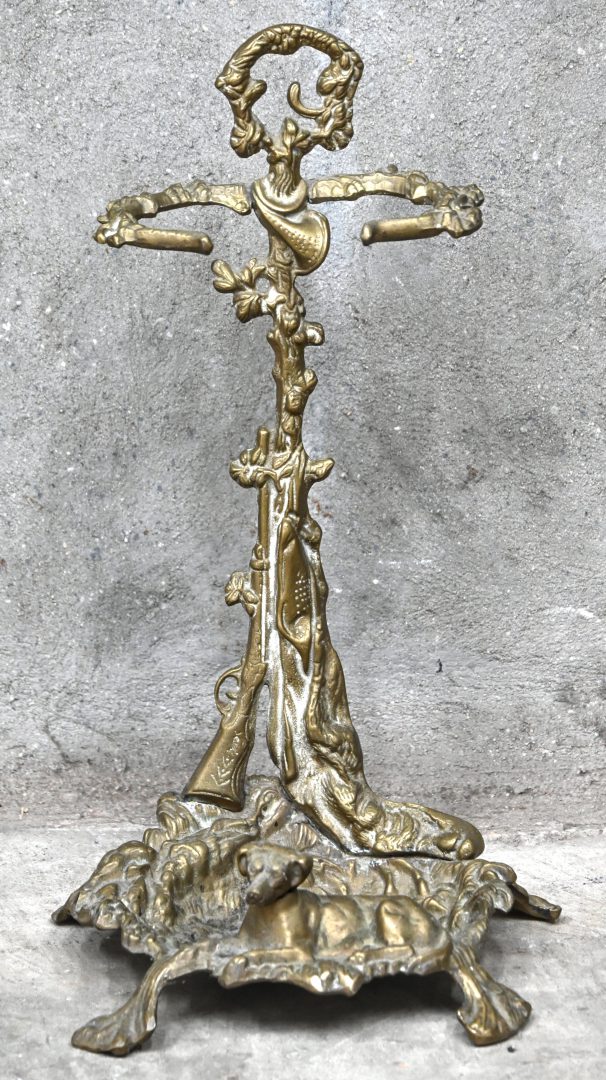 #598Een messing inktpothouder, versierd met saterkoppen, met porseleinen inktpot.