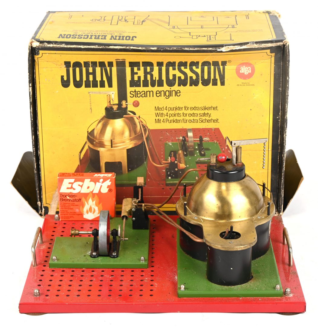 Een miniatuur stoommachine van messing en plaatijzer. In oorspronkelijke doos.