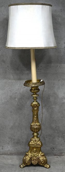 A standing lamp with a brass base, shade damaged. -