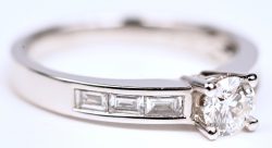 #370Een 18 kt witgouden ring bezet met centrale briljant van 0,41 ct. en diamand baguettes met een gezamenlijk gewicht van 0,32 ct.