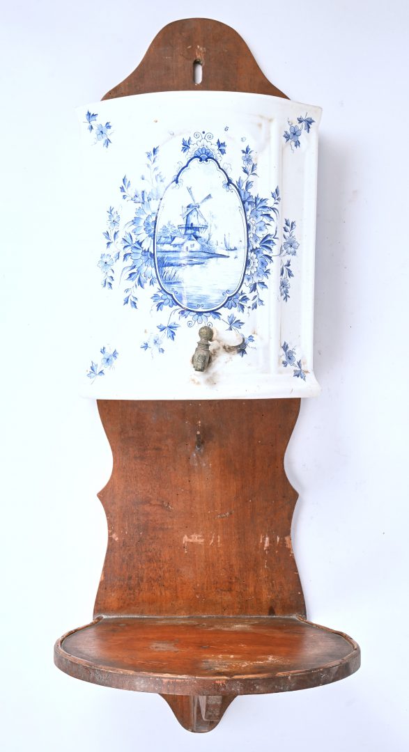 Een muurfontein Delfts blauw-wit aardewerk aan houten wandconsole, onvolledig.