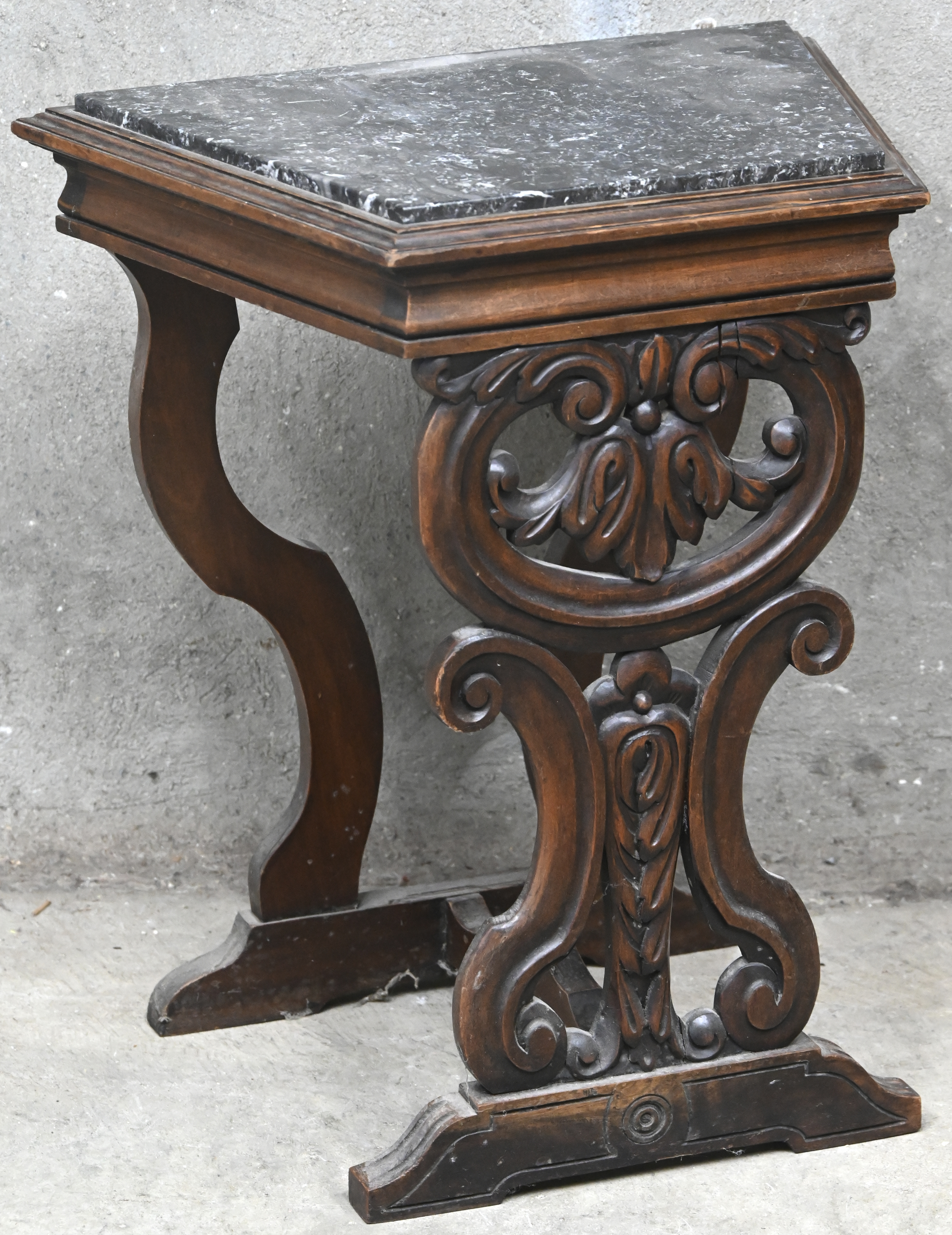 Een muurtafeltje, gesculpteerd eikenhout met een marmeren blad.