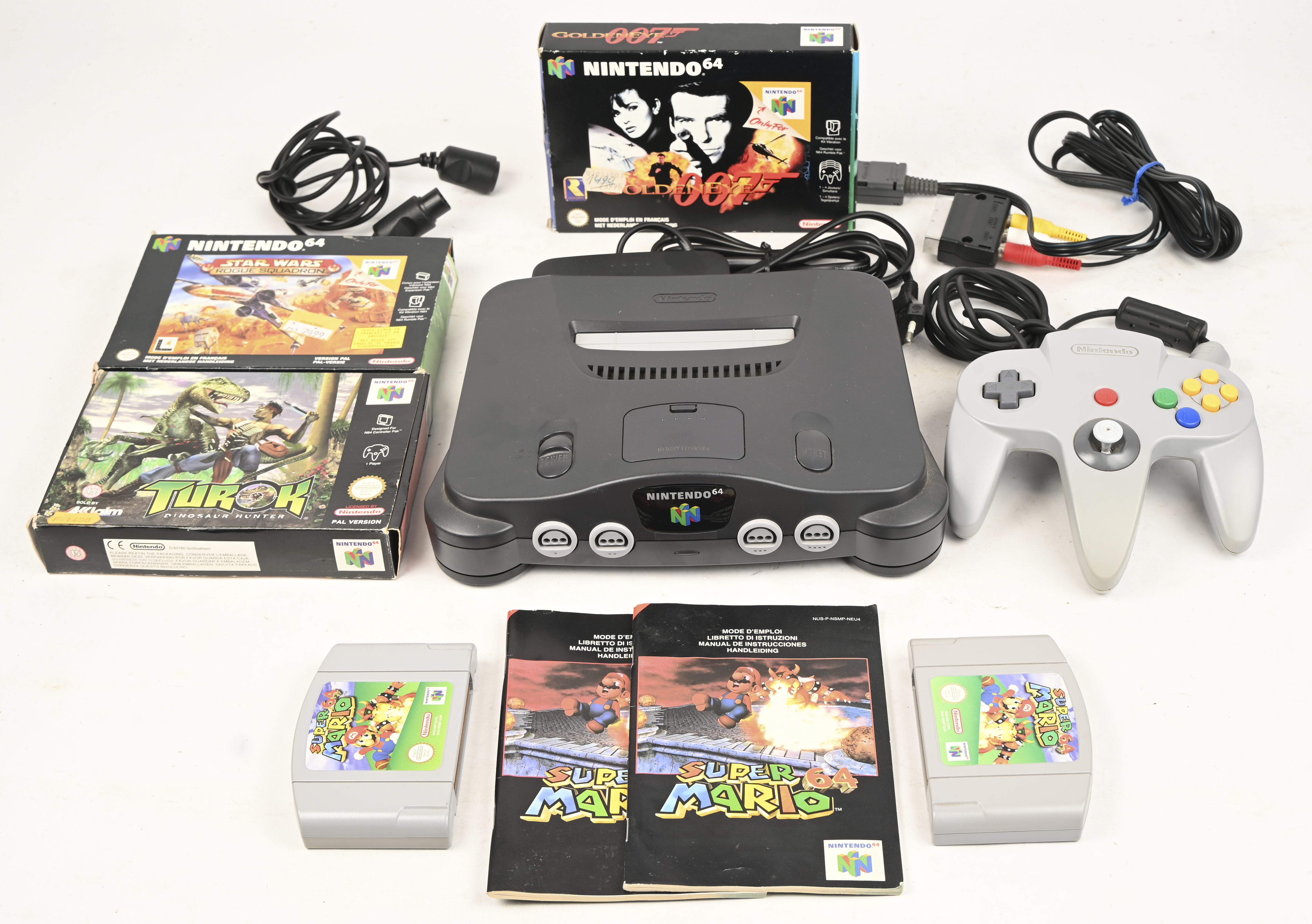 A Nintendo 64 with 5 games, controller, AV cable & power adapter. - 2 x Super Mario 64 with manual (no box). - Turok, Dinosaur Hunter in original box with manual. - Star Wars Rogue Squadron in original box (poor condition) without manual. - Golden Eye, 007, good condition, complete box with manual and all documents.