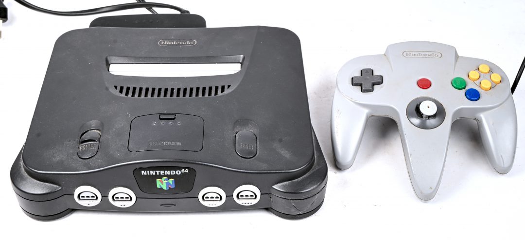 A Nintendo 64, with controller, adapter, and AV cable. Repair at front right corner.