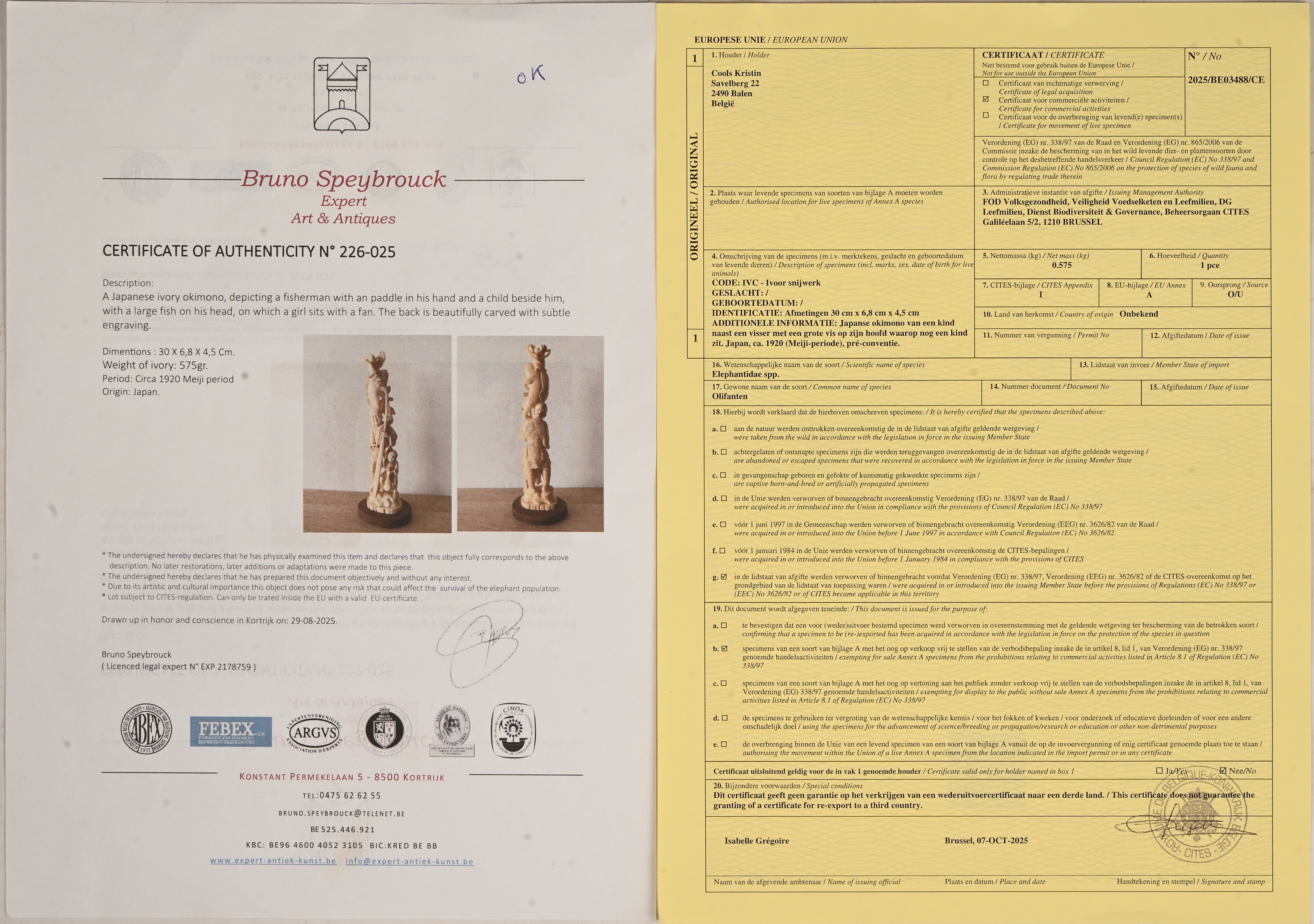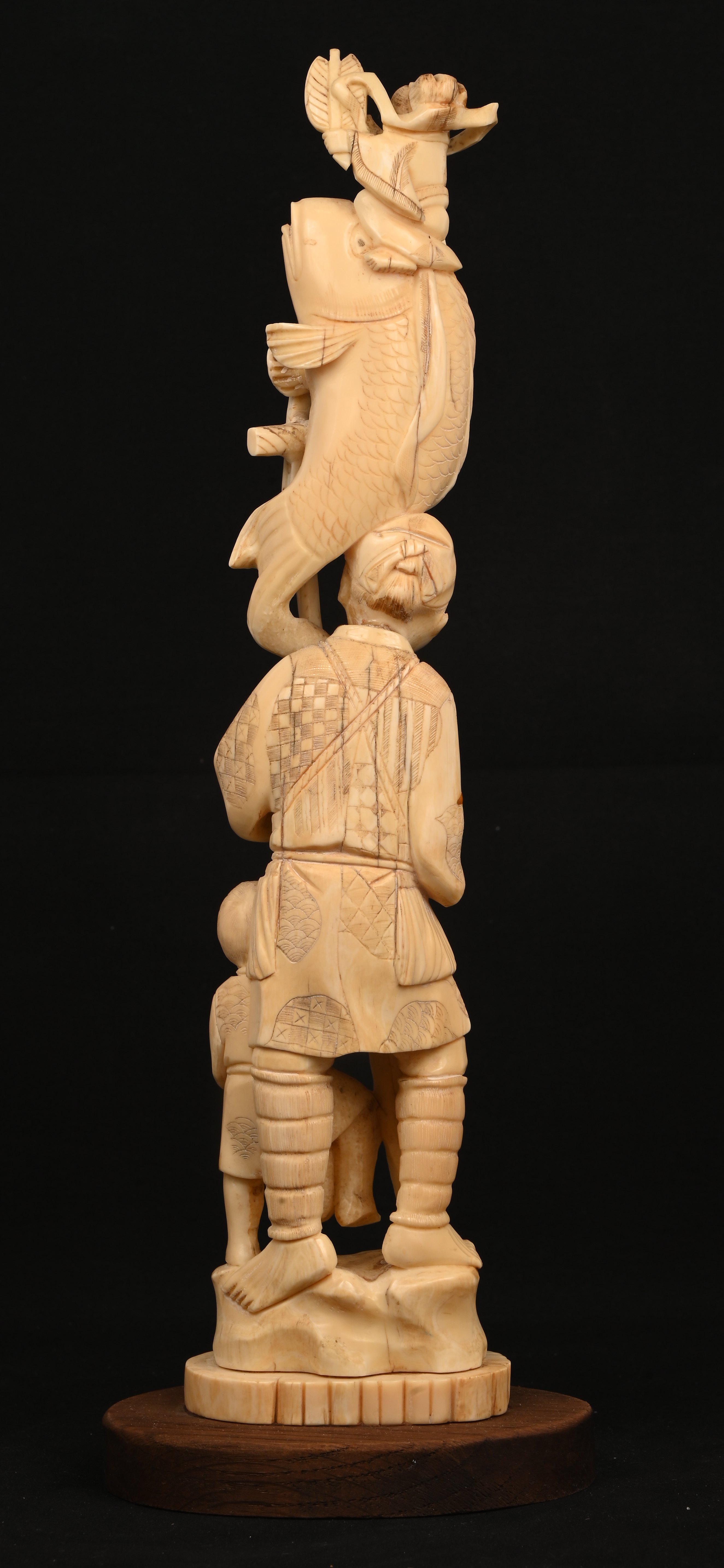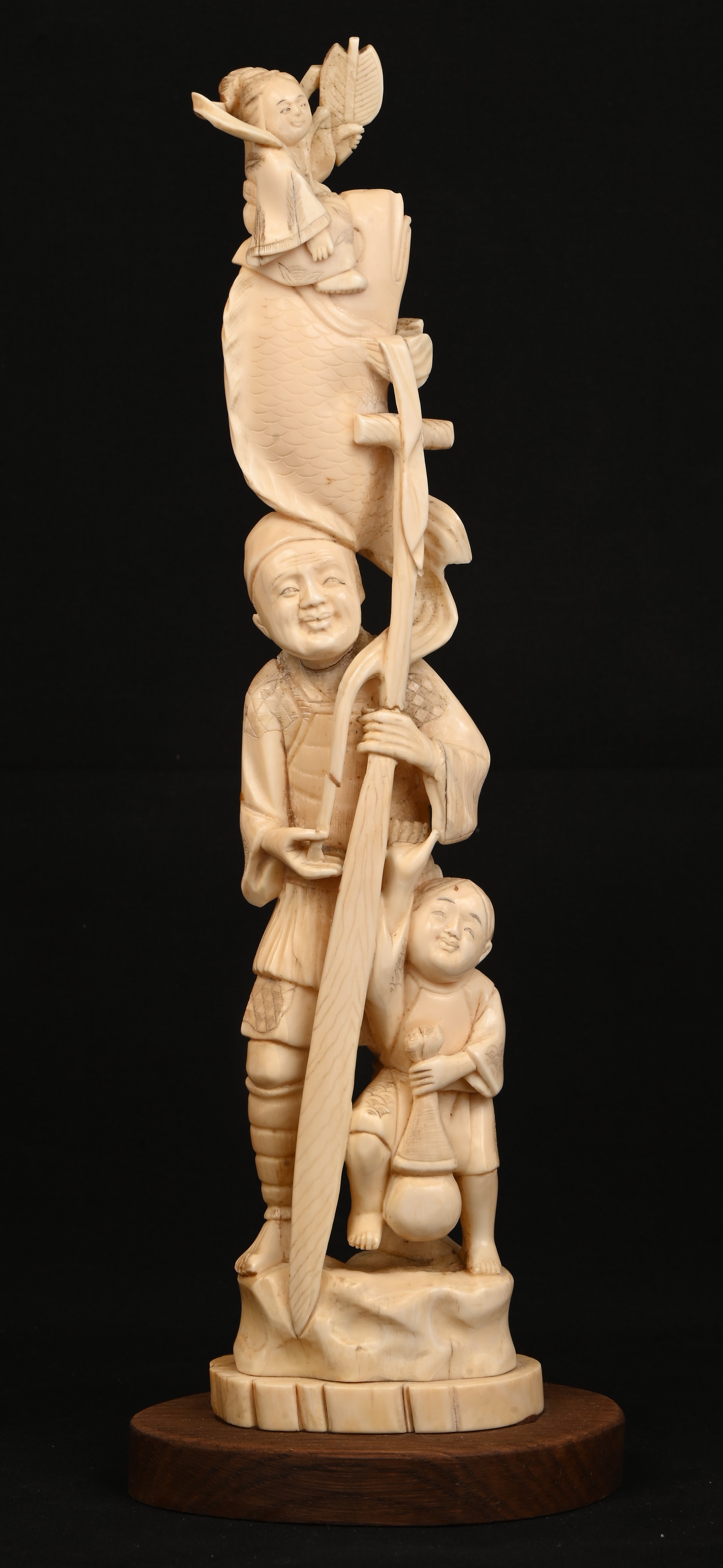 An okimono of a fisherman with an oar accompanied by children and with a large fish. Japanese work. With Cites certificate.