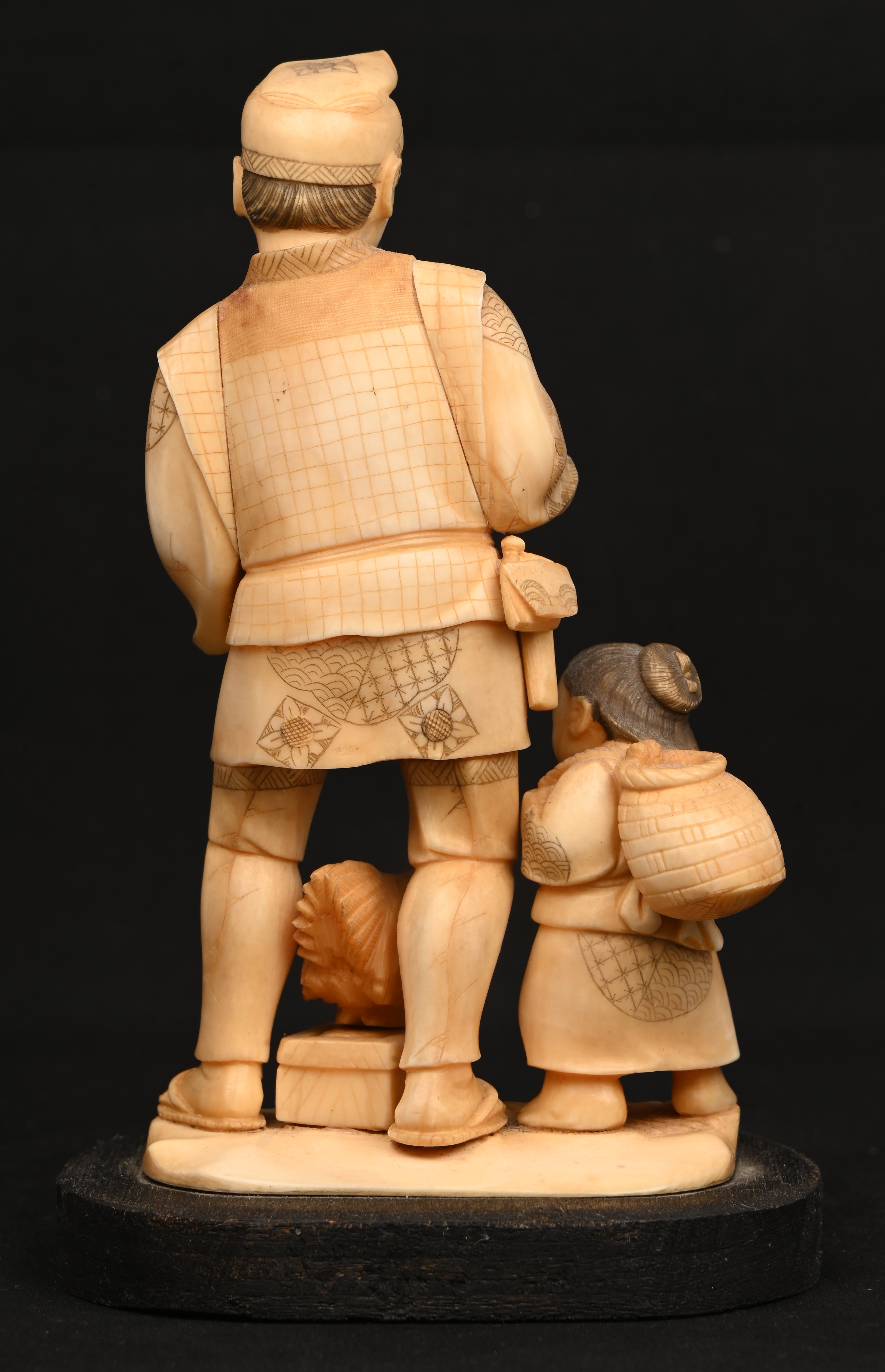 An okimono of carved ivory depicting a composite scene of a friendly farmer with his child and a chicken. Japanese work. With Cites certificate.