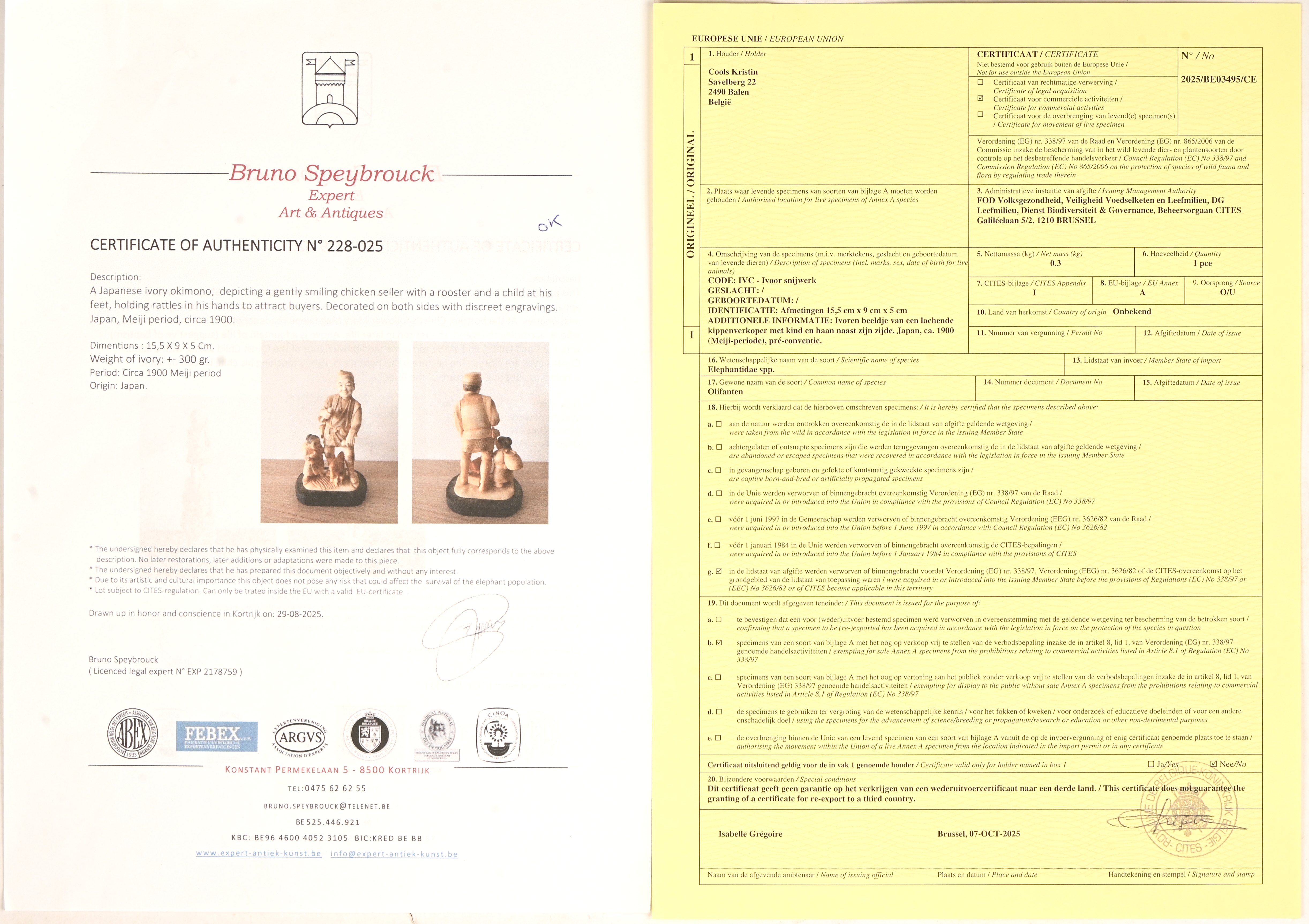 Een okimono van gebeeldhouwd ivoor met een samengestelde voorstelling van een vriendelijke boer met zijn kind en een kip. Japans werk. Met Citesattest.