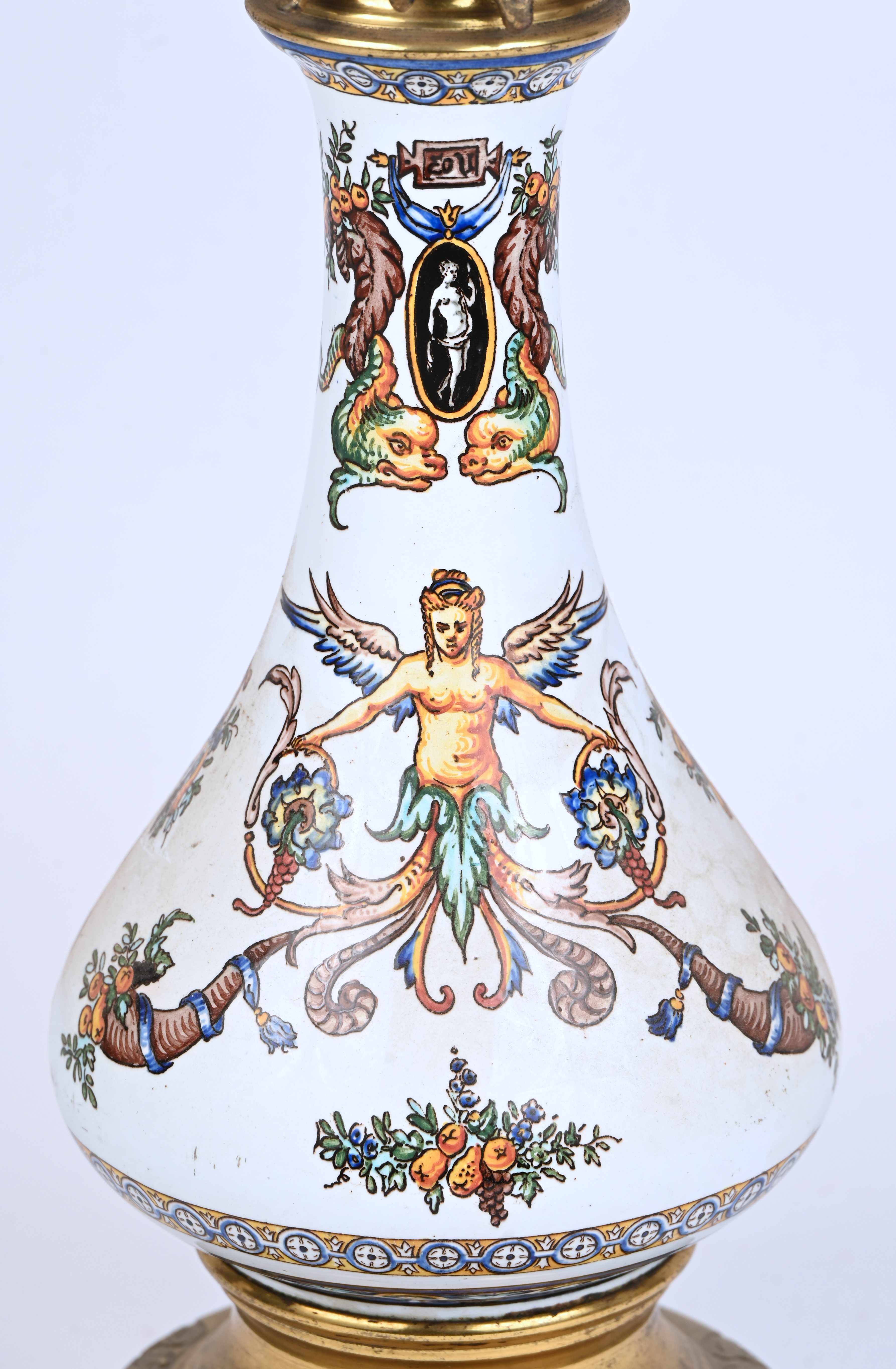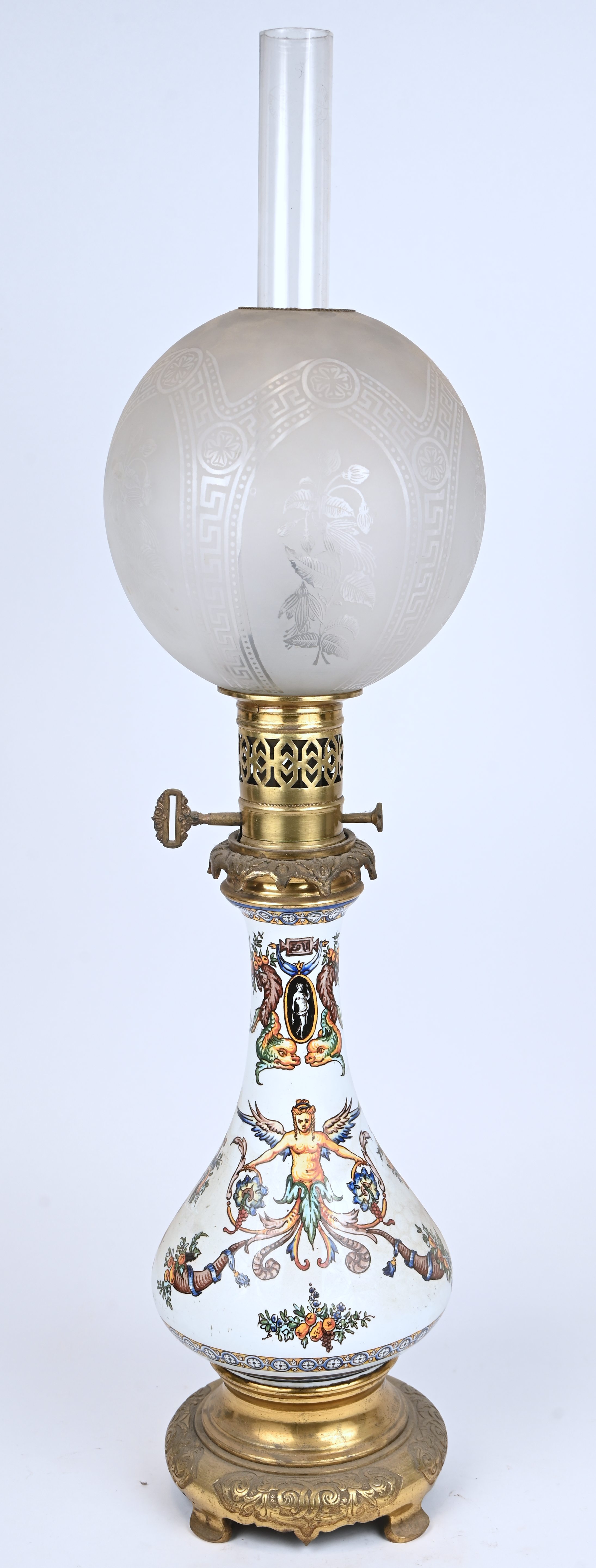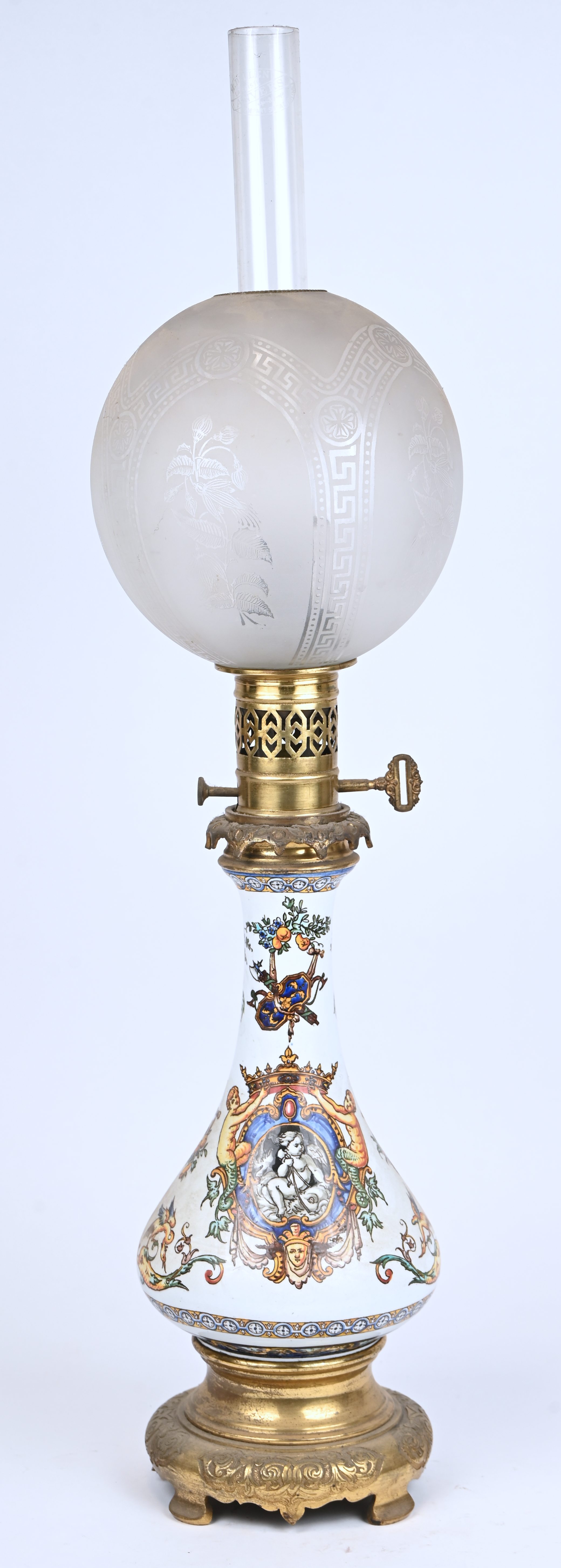 Een olielamp, messing, aardewerk en glas, vermoedelijk Gien.