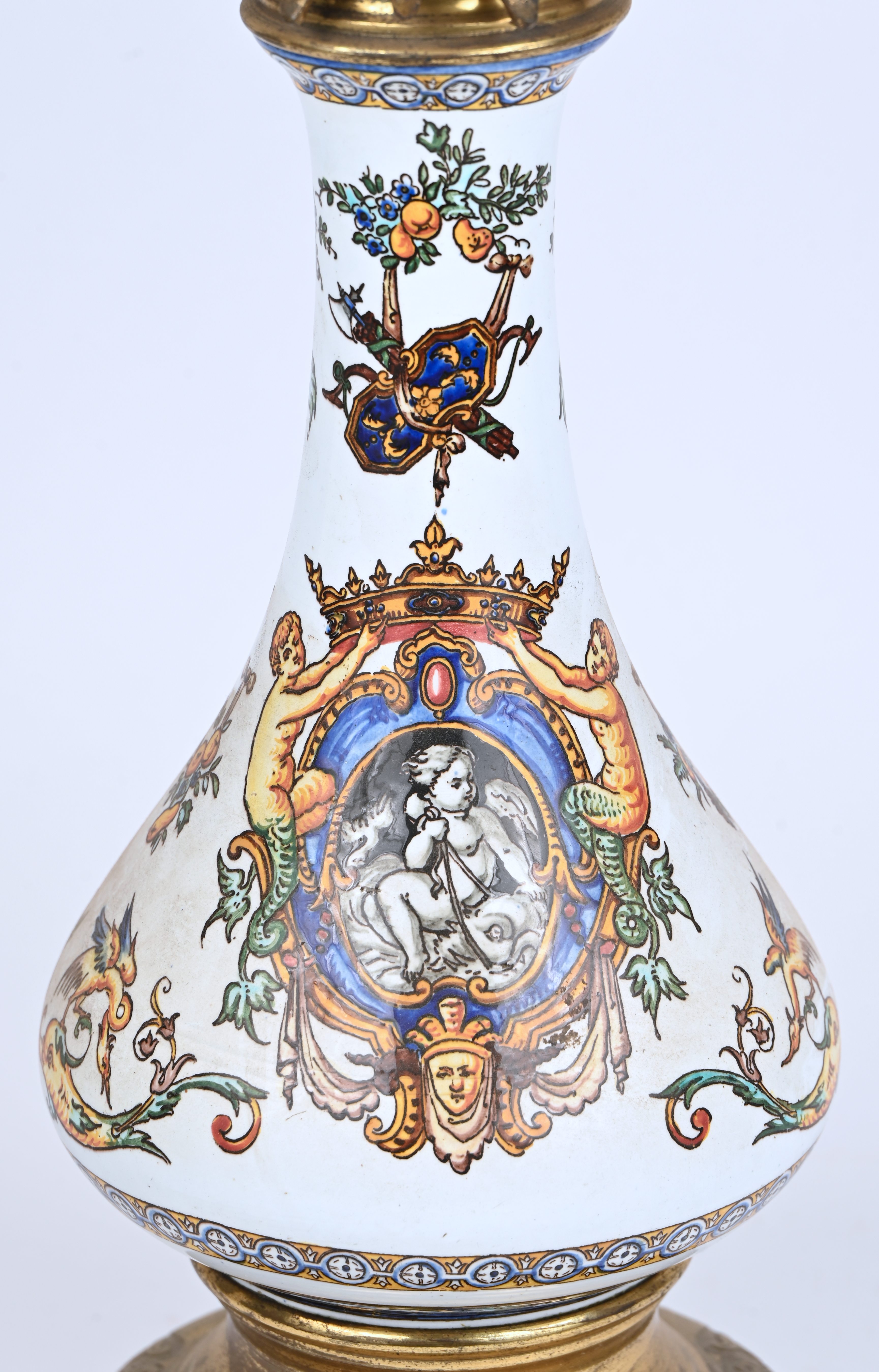 An oil lamp, brass, earthenware and glass, probably Gien.