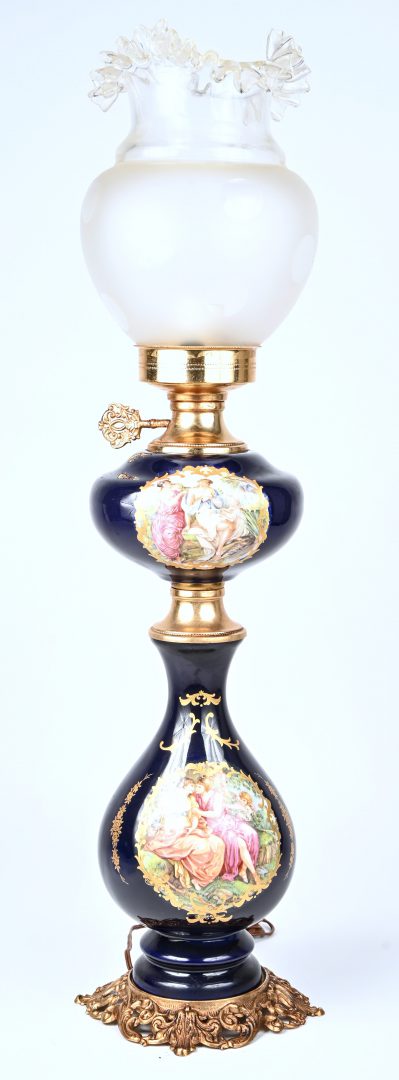 An oil lamp made of cobalt blue porcelain, brass, and glass.
