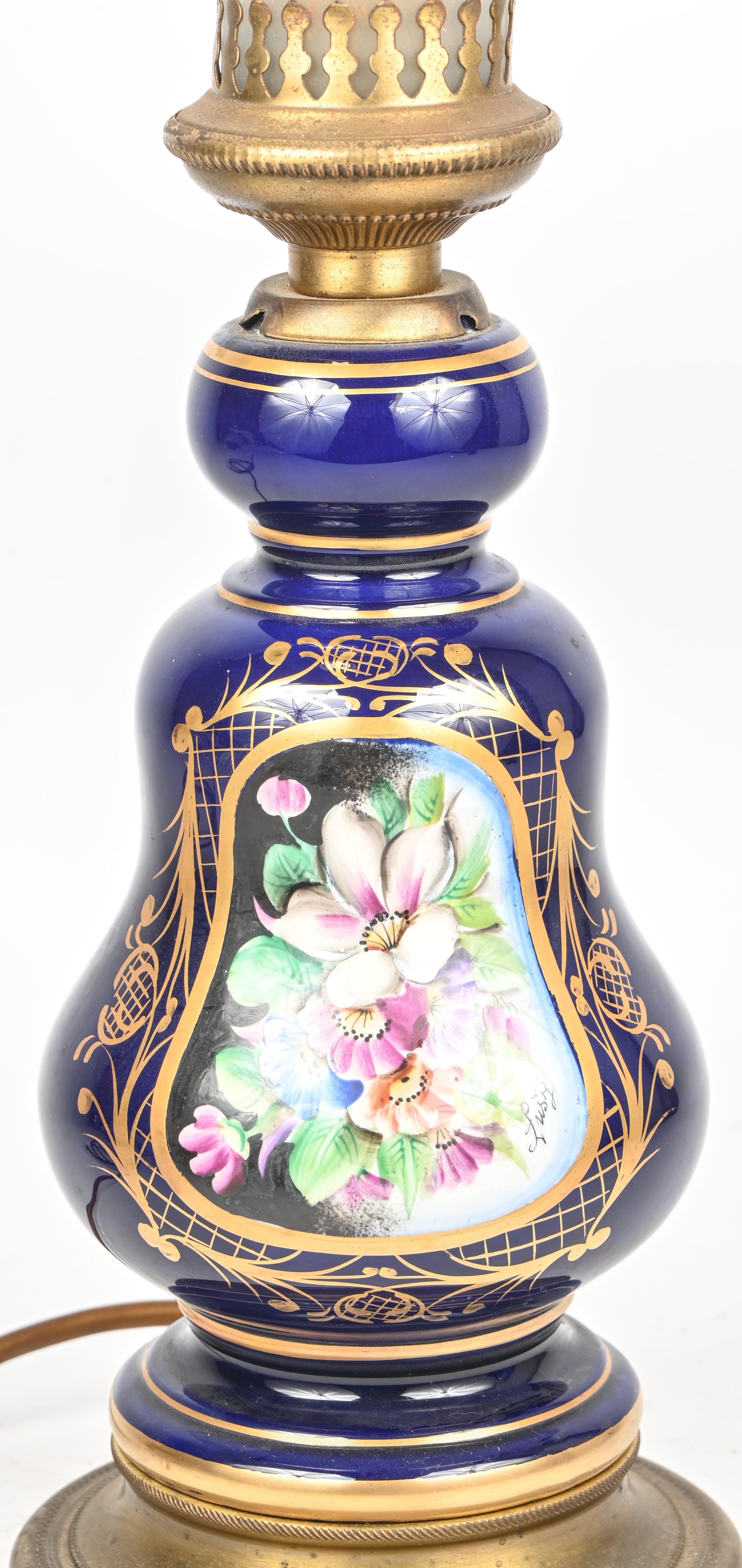 Een asbakstandaard, rijkelijk versierde messing voet en glazen asbak, in 2 delen.