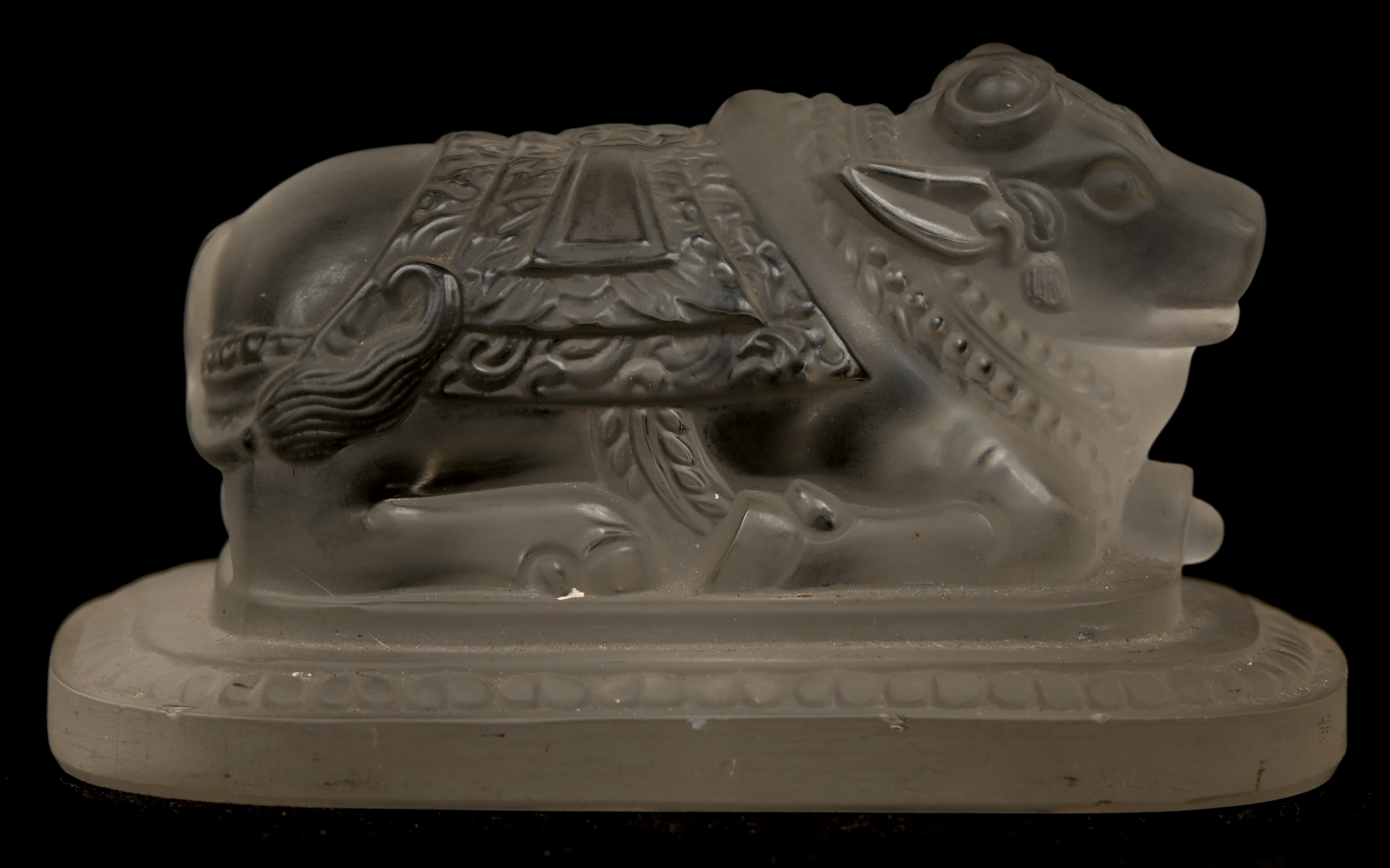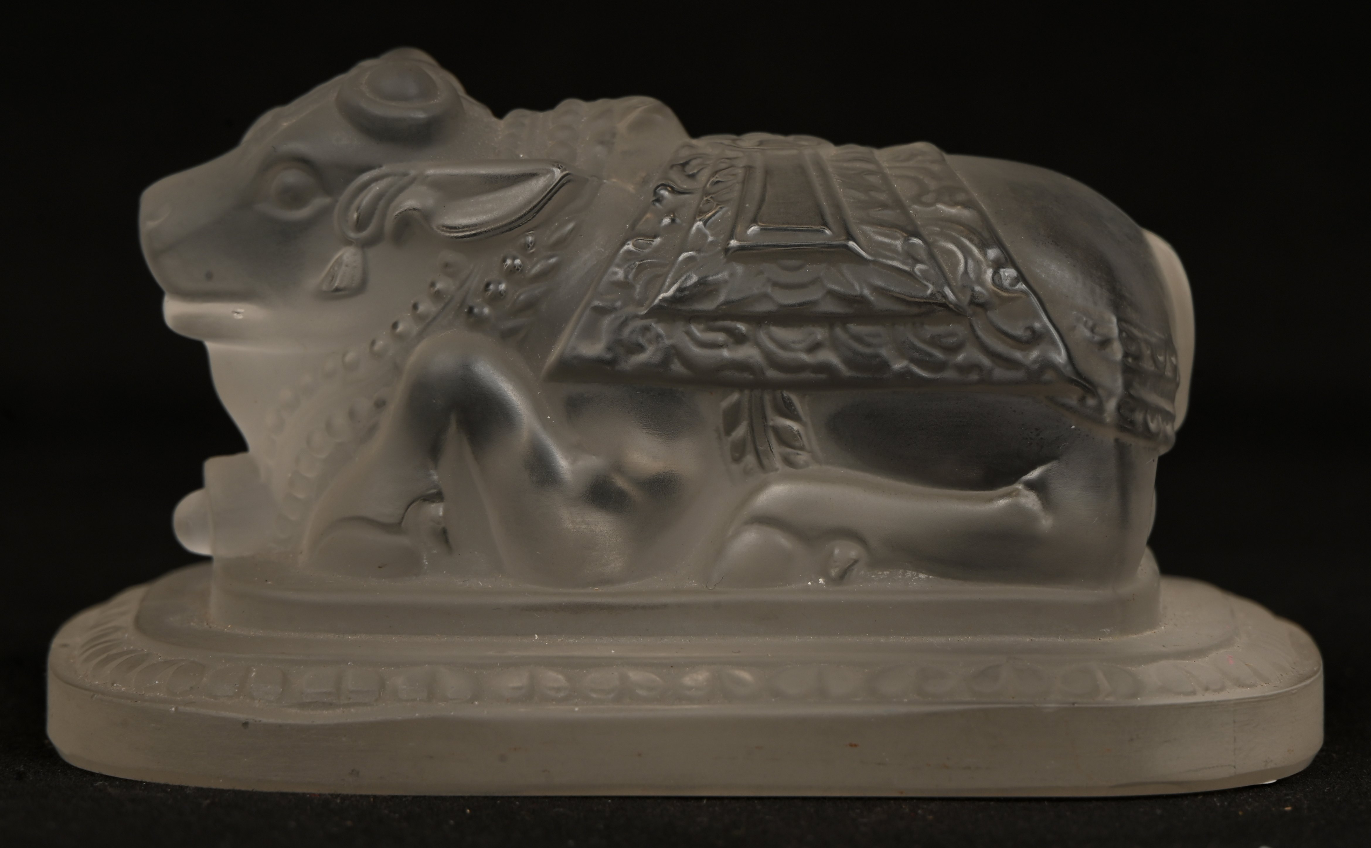 Een opaak glazen beeldje van een heilige koe. Gemerkt ‘R. Lalique France’, gemaakt voor ‘Rotterdam Lloyd, Royal Dutch Mail’.