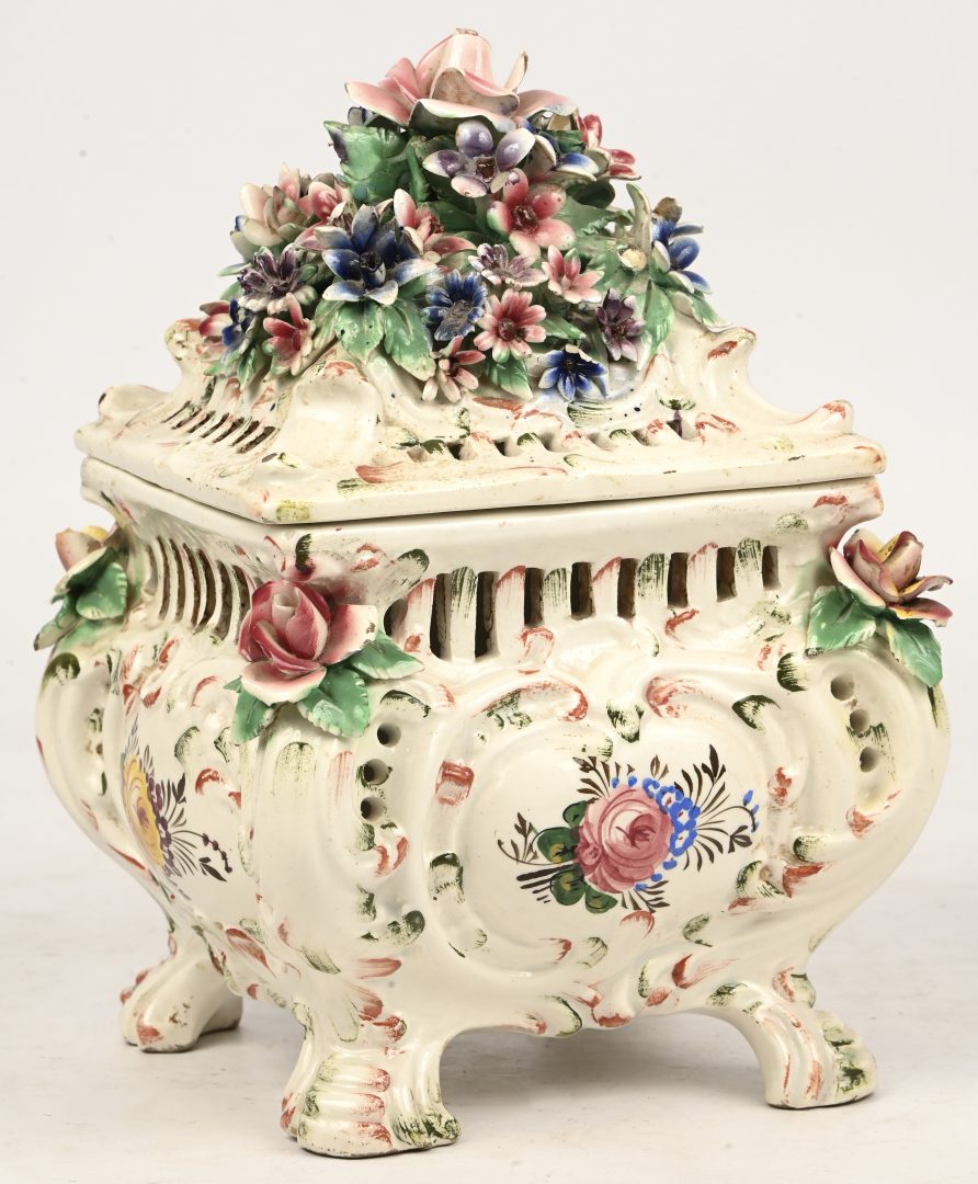 Een Boch dekselvaas met bloemendecor en een leeuw als dekselknop.