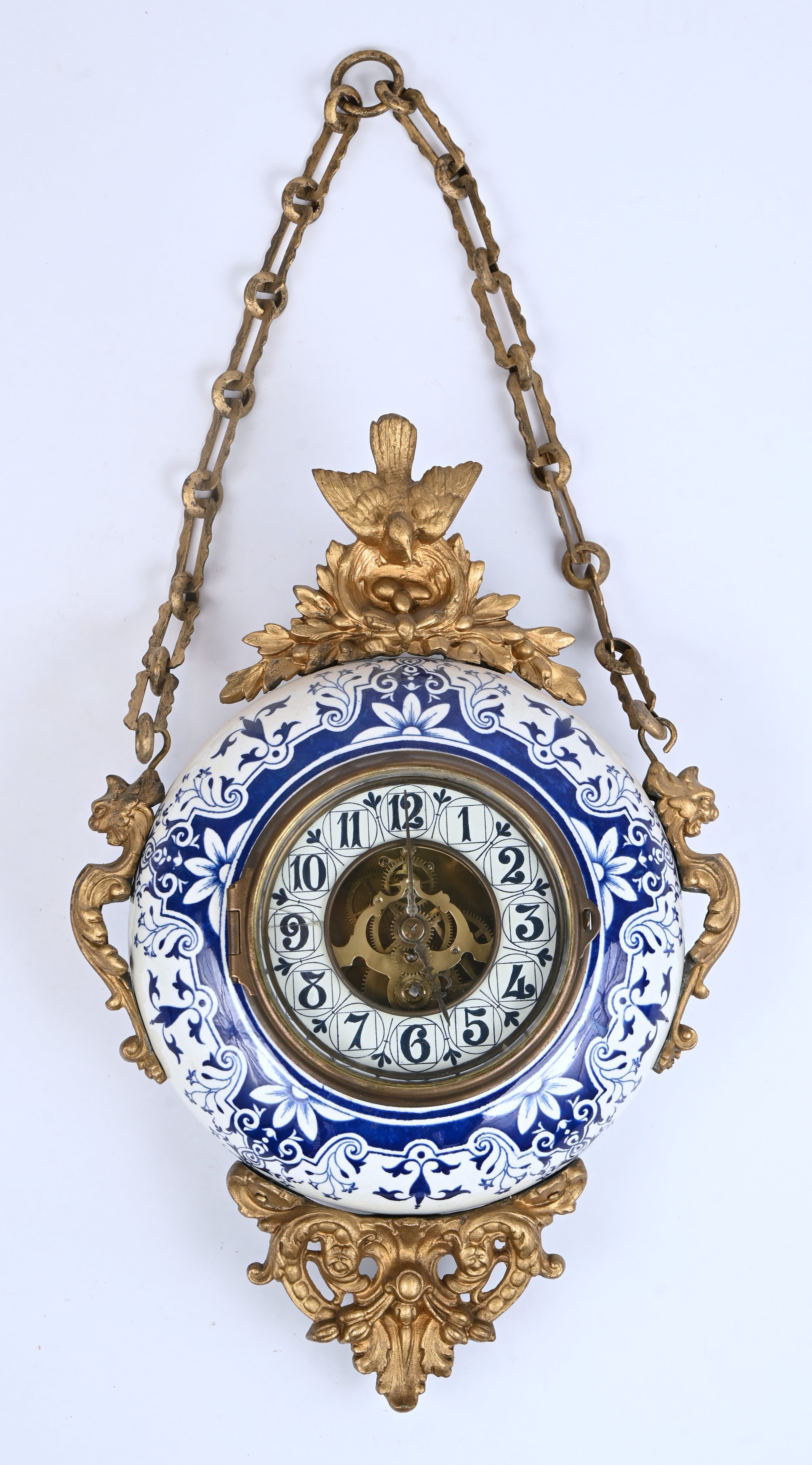 Een opengewerkte ronde klok, Delfts blauw aardewerk met verguld zamak. Barst in wijzerplaat.