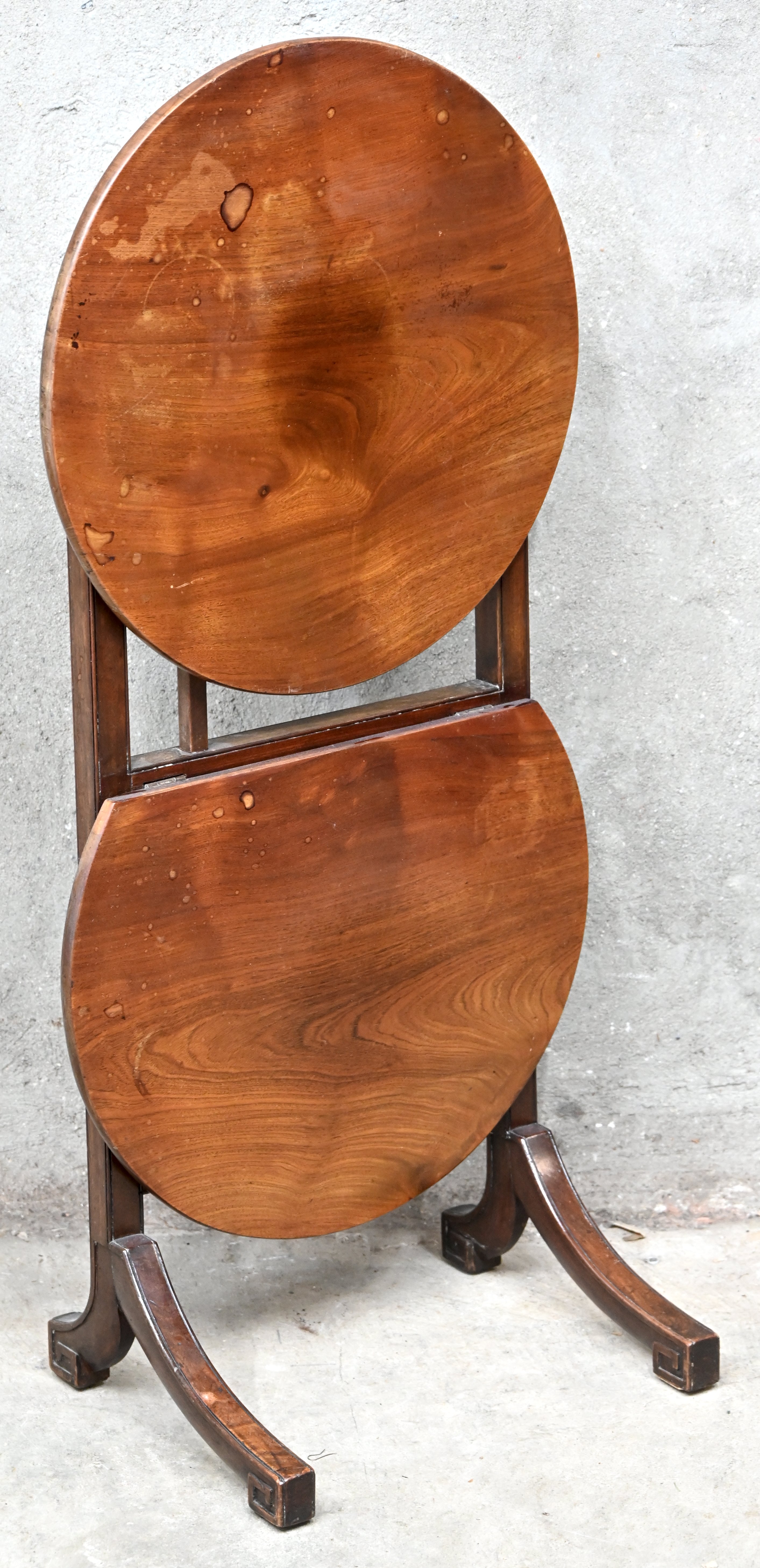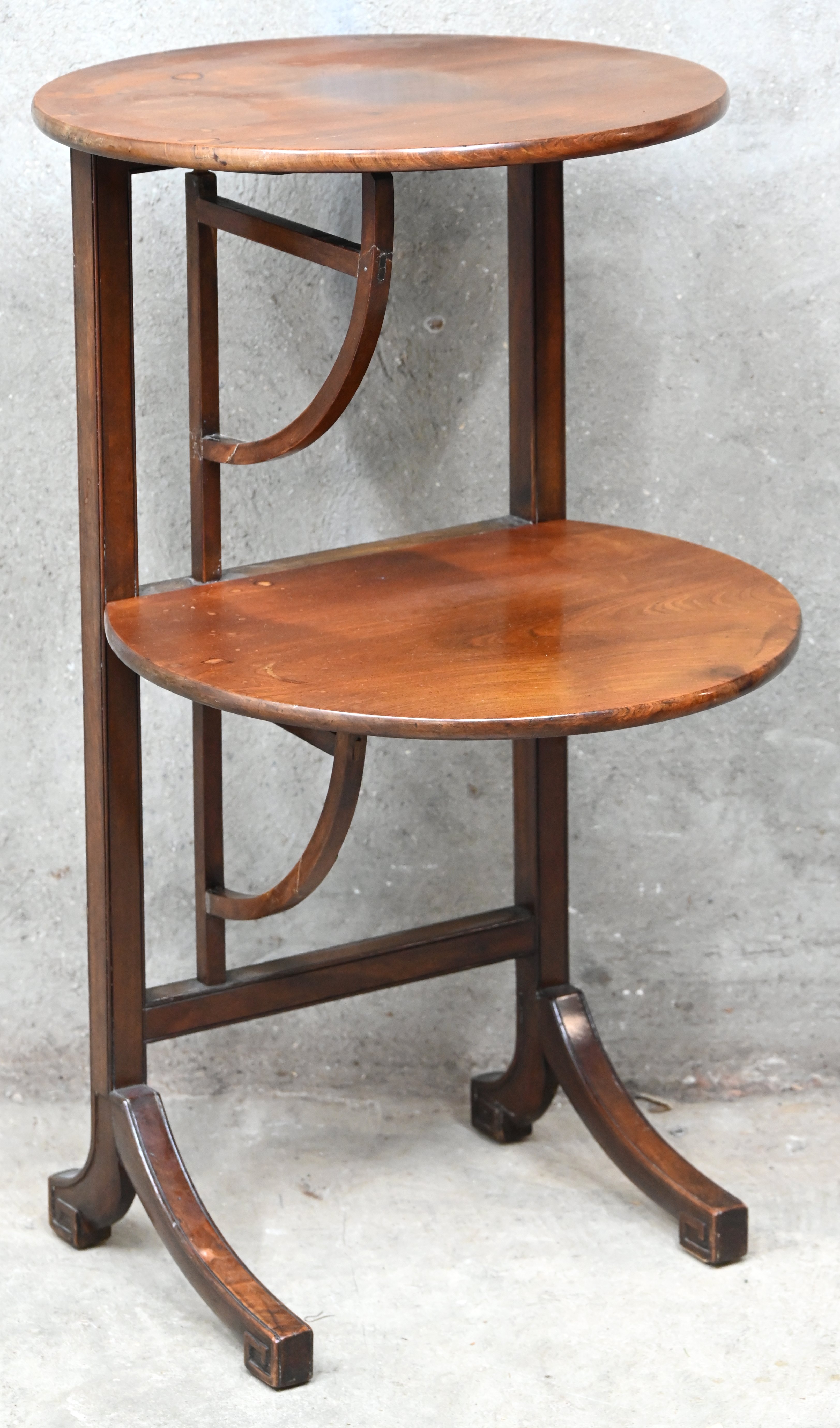 A folding wine table with two levels. With some old repairs.