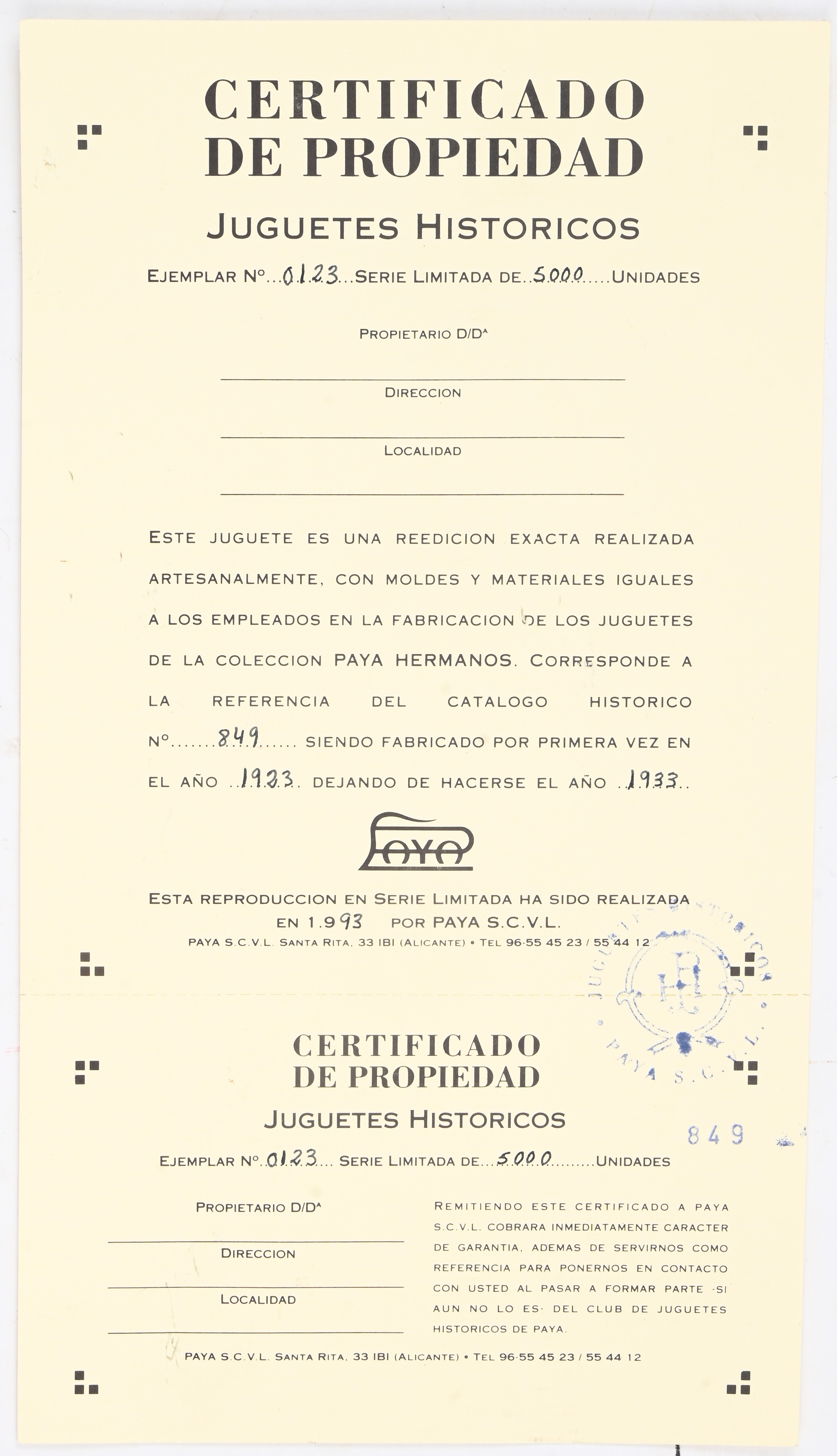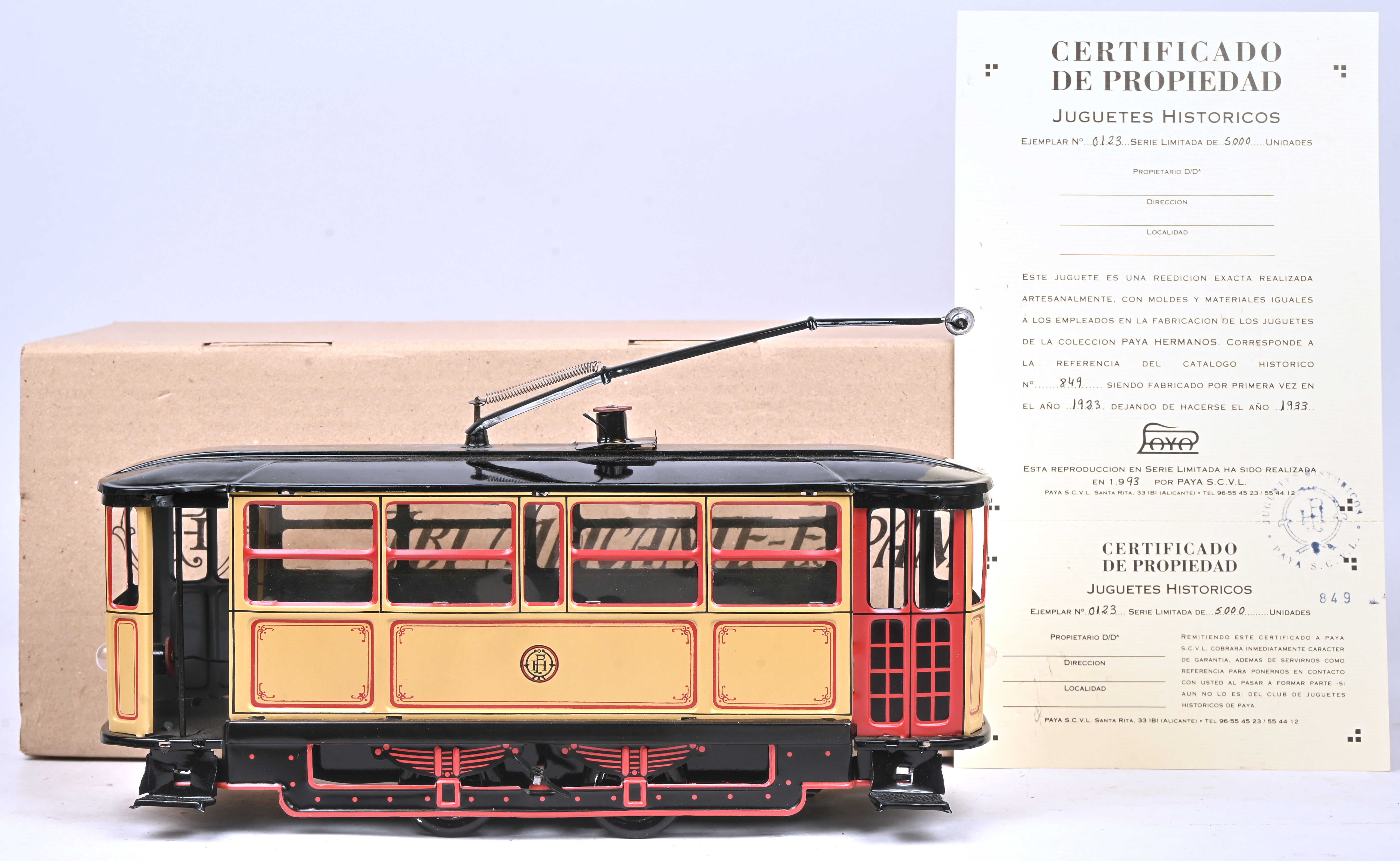 #23Paya juguetes JBI (Alicante-Espana)Period: 1991Een opwindbare blikken wagen met verlichting. Dit stuk is een reproductie van een model uit 1934-42. Nr. 317 uit een oplage van 5000 exemplaren. Met certificaat en OVP.