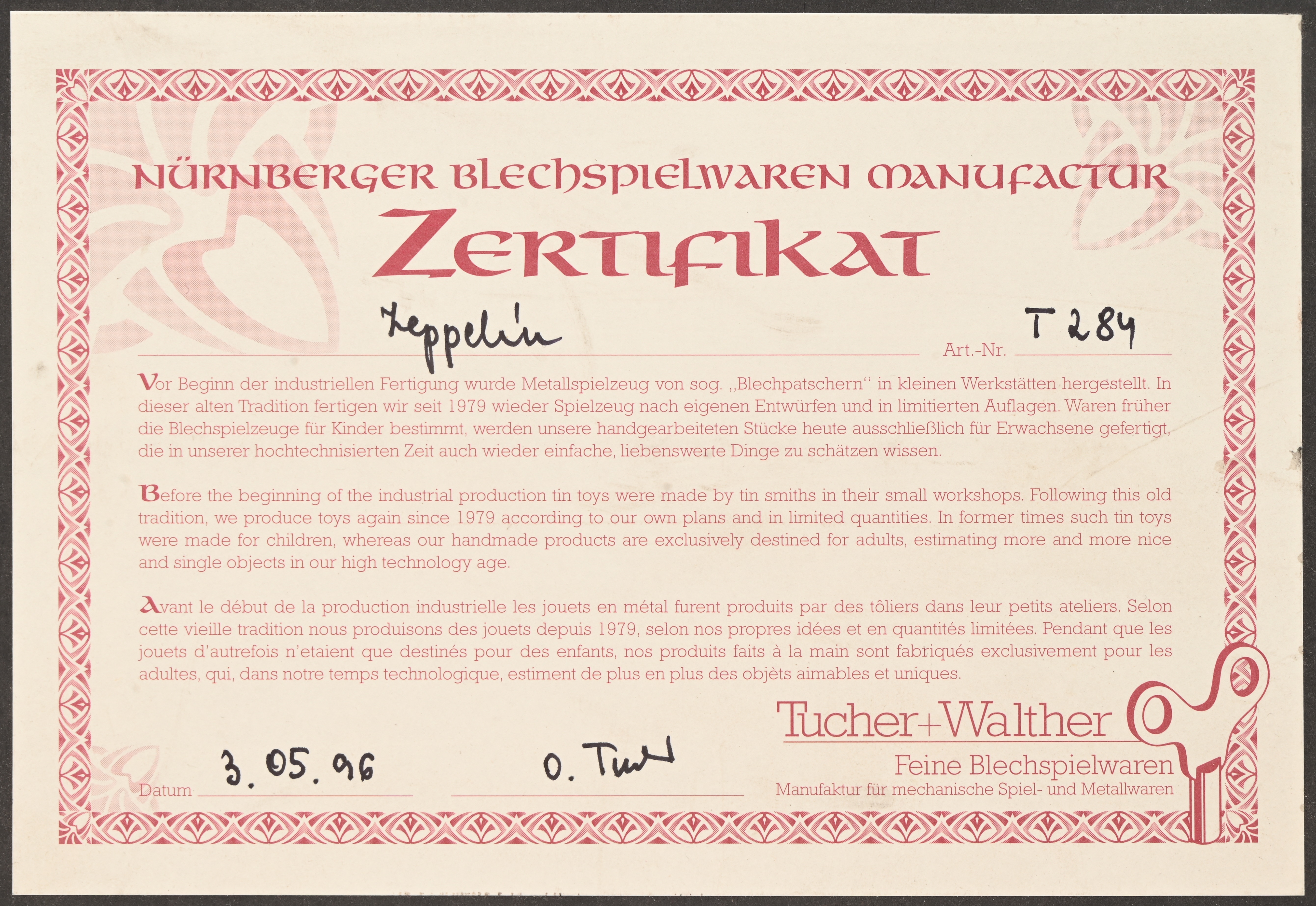 Een opwindbare blikken zeppelin, model T-284. Nr. 22 uit een oplage van 500 exemplaren. Met OVP.