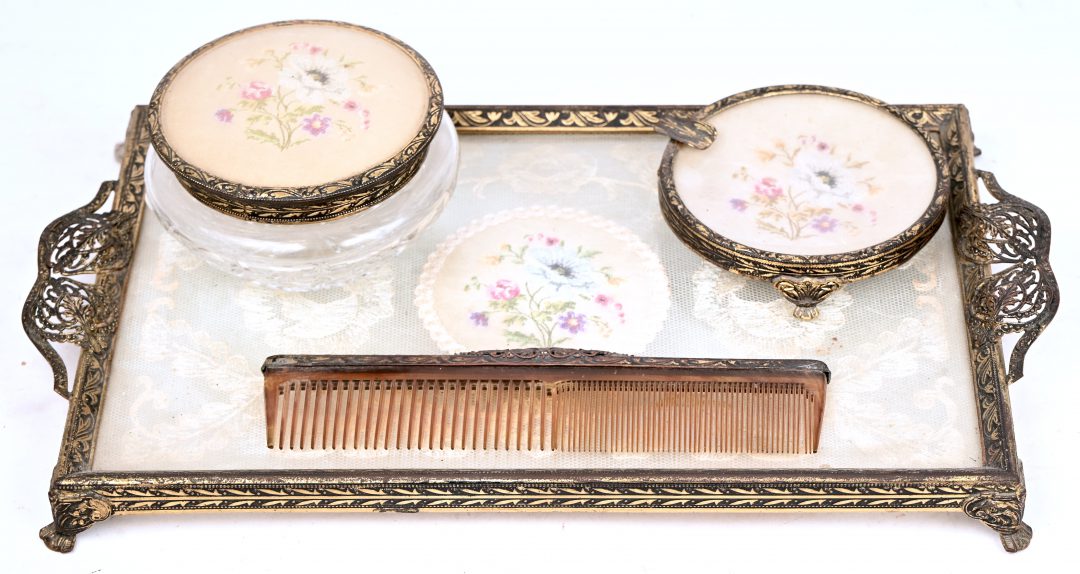 Een oud gevarieerd lotje bestaande uit een dienbladje, een kan, een asbak en een bonbonnière.