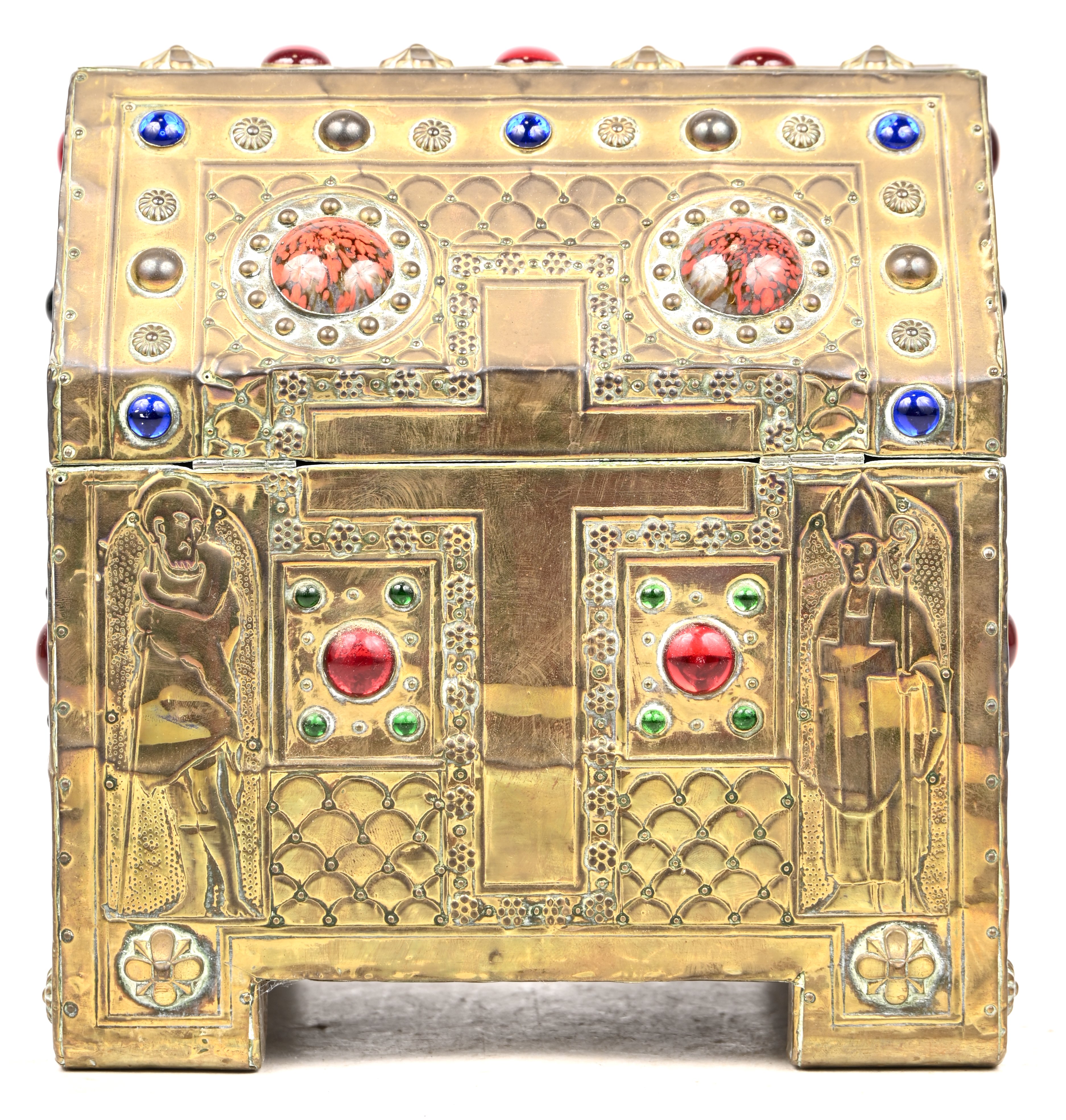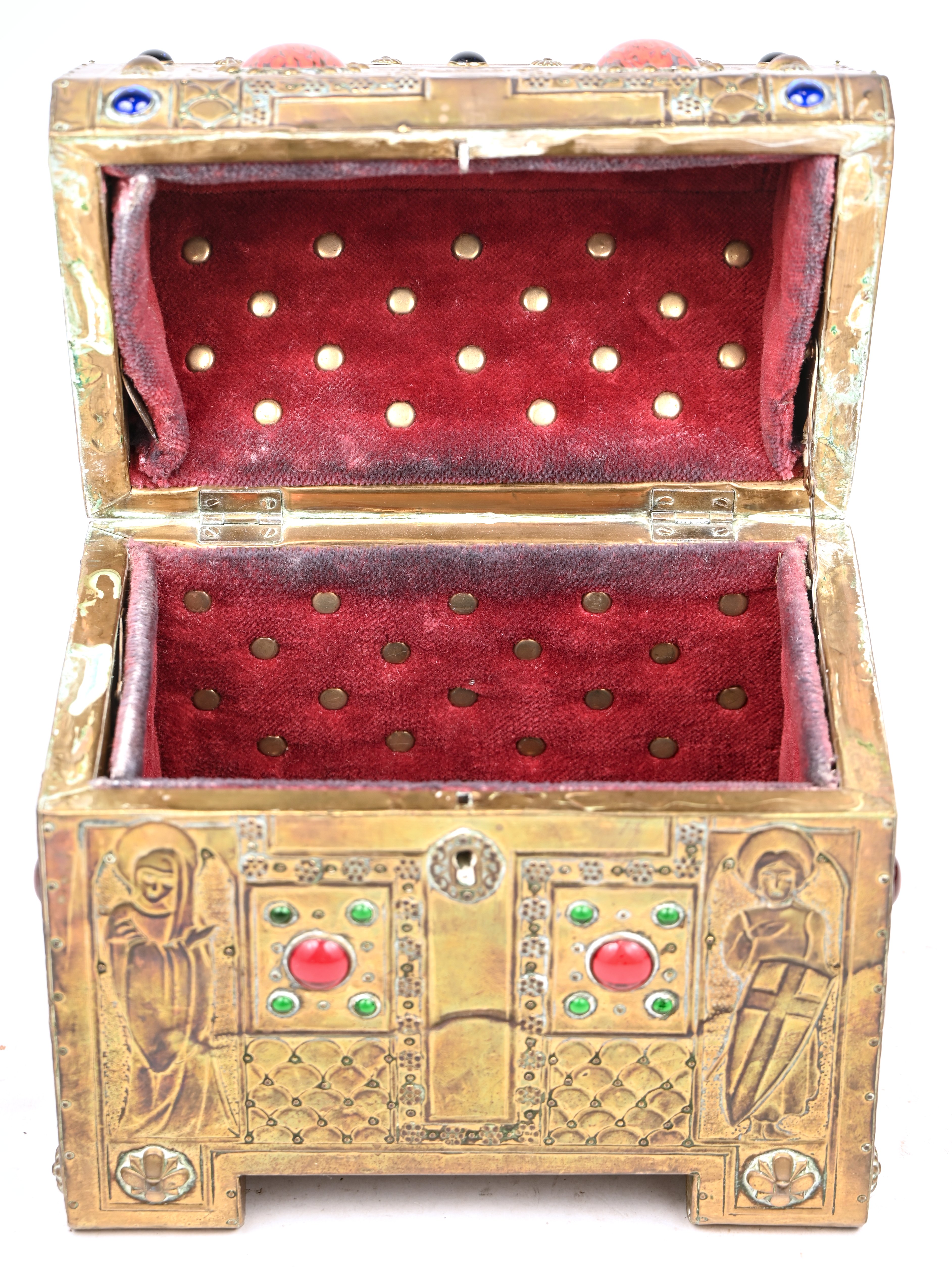 Een oud houten schatkistje, met koper en sierstenen bekleed, in de geest van Alfred Louis Achille Daguet. Circa 1900.