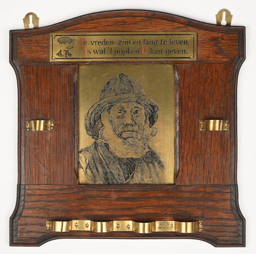 Een oud pijpenrekje, messing en hout.