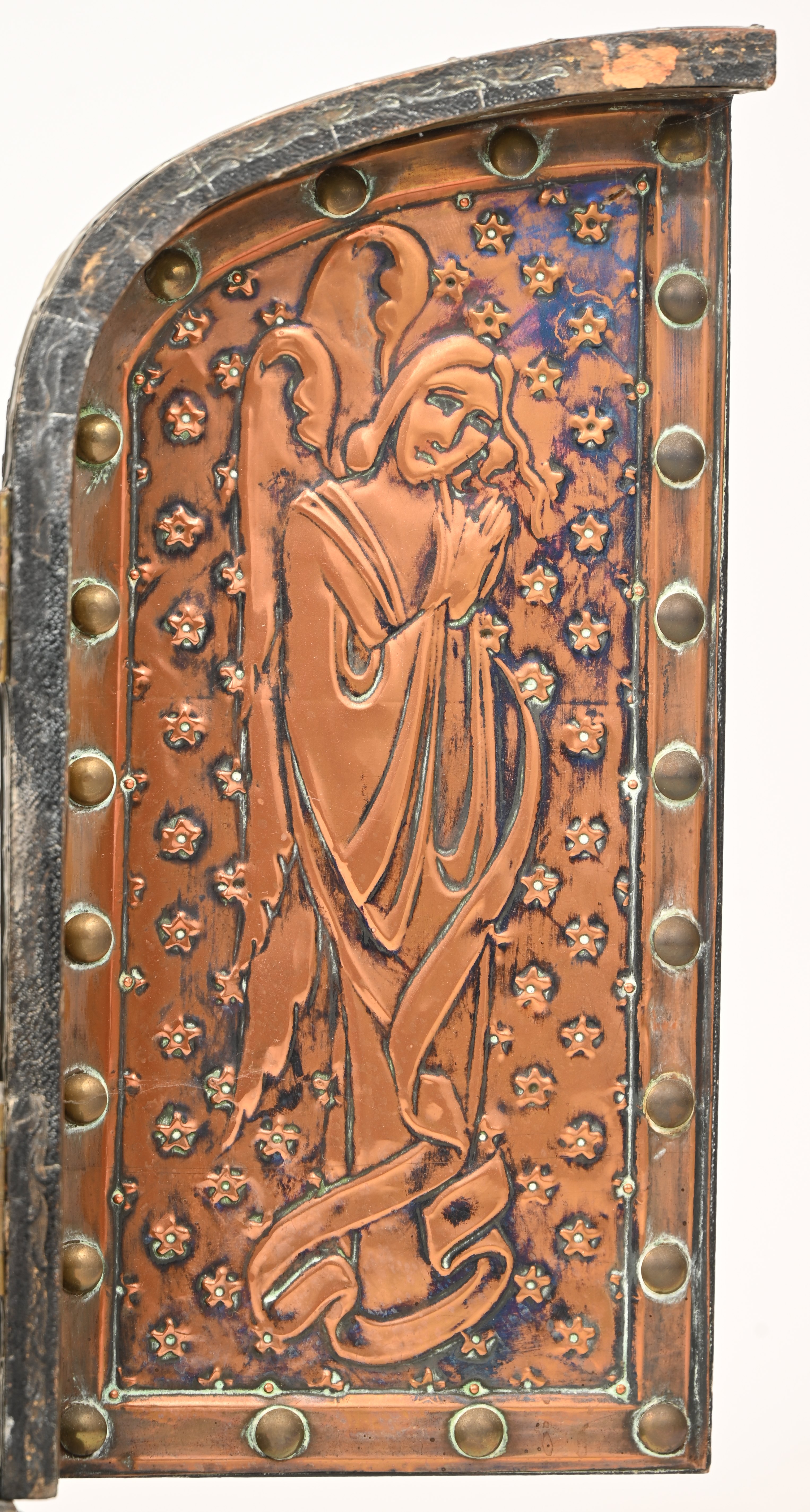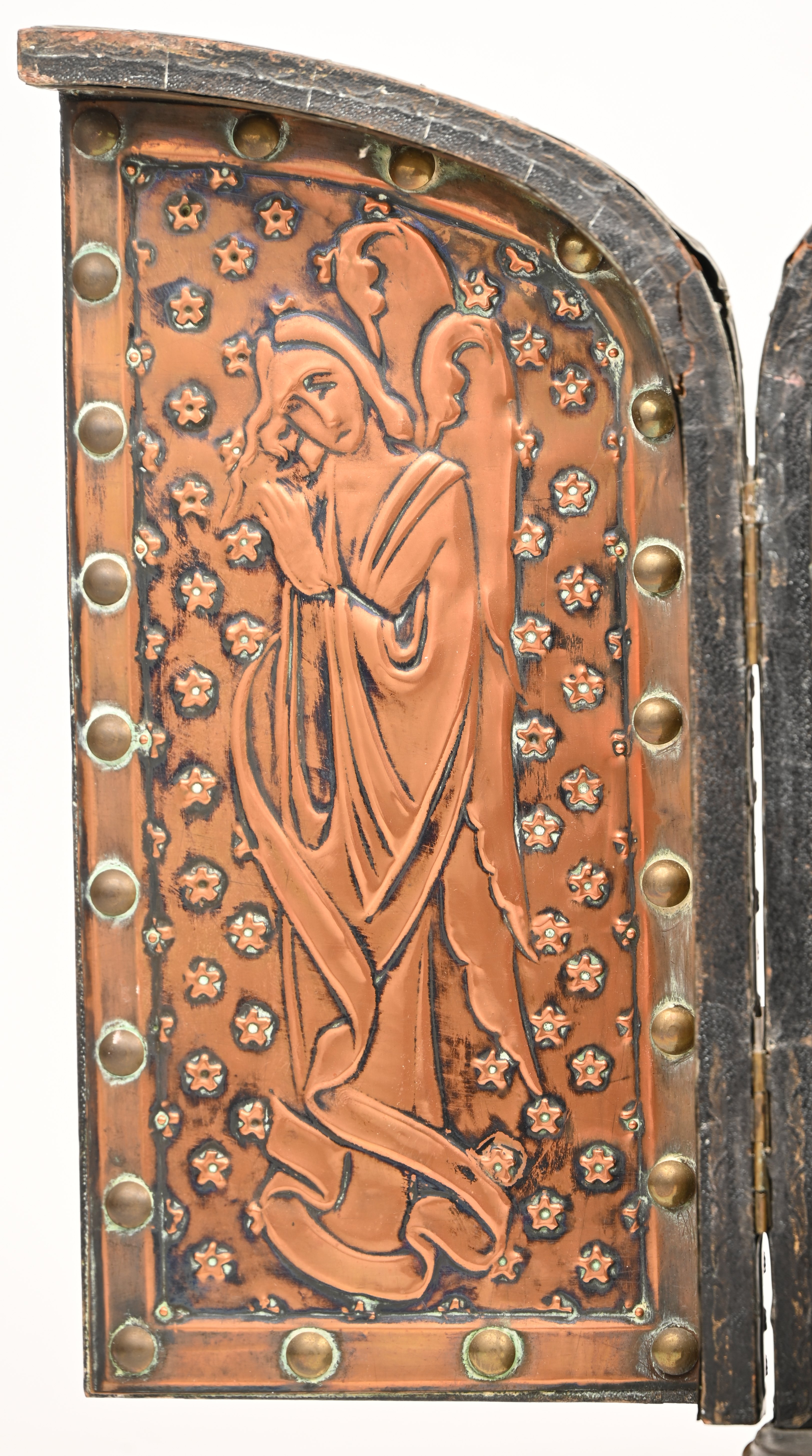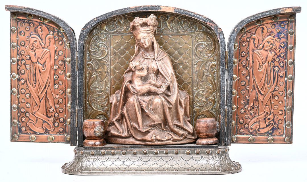 Een oud religieus drieluik met plaasteren Madonna en kind in een houten kastje bekleed met koper en tin. In de geest van Alfred Louis Achille Daguet. Circa 1900.