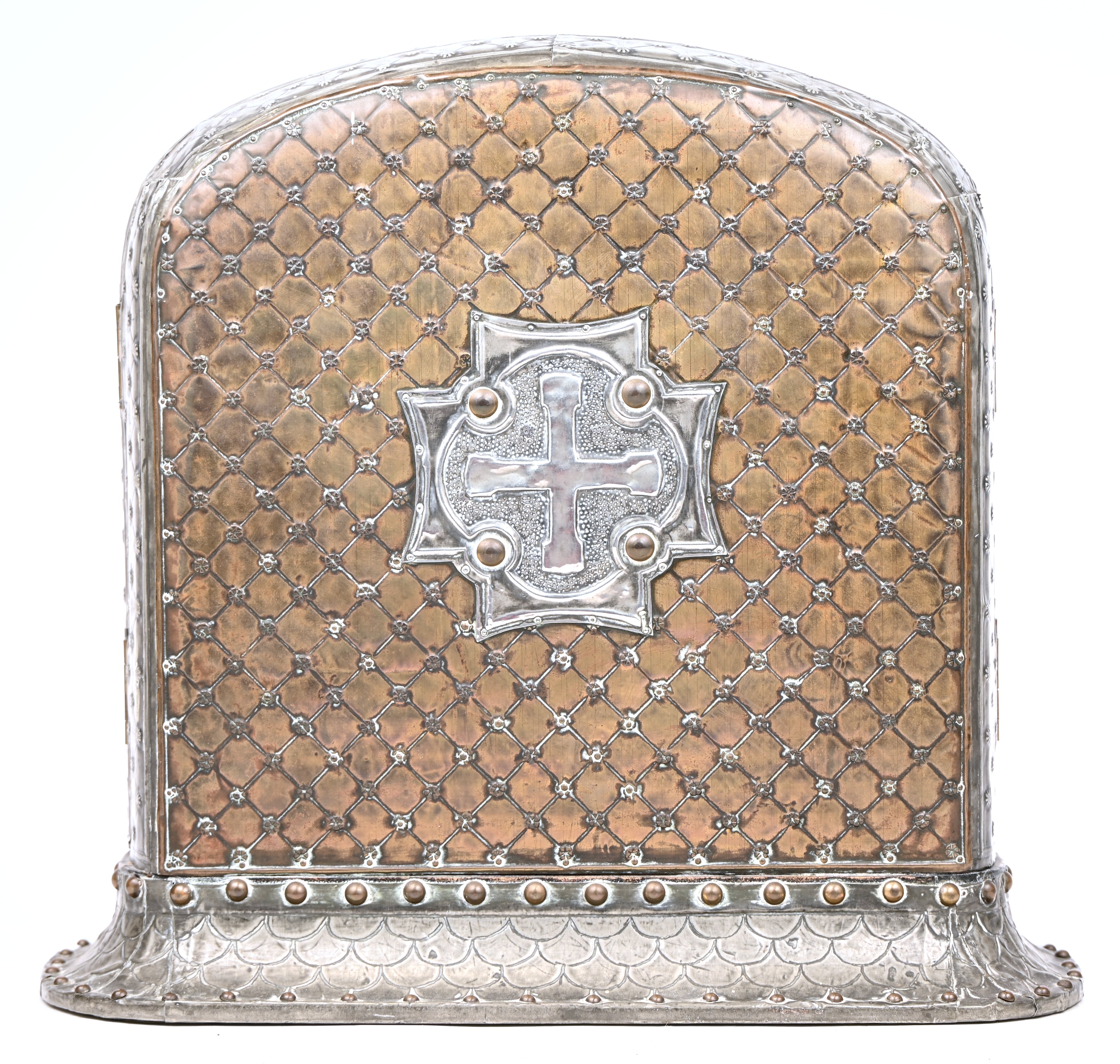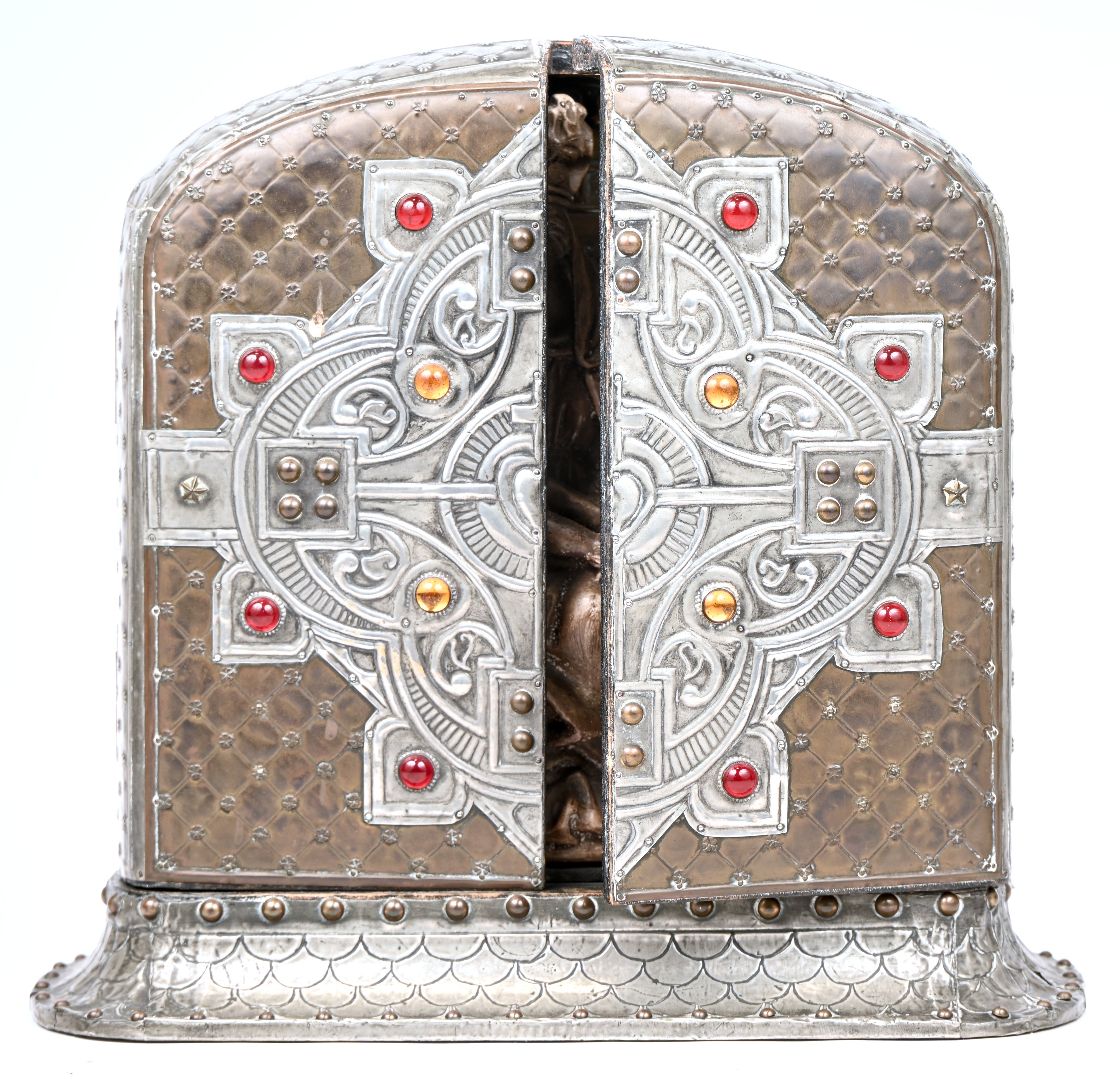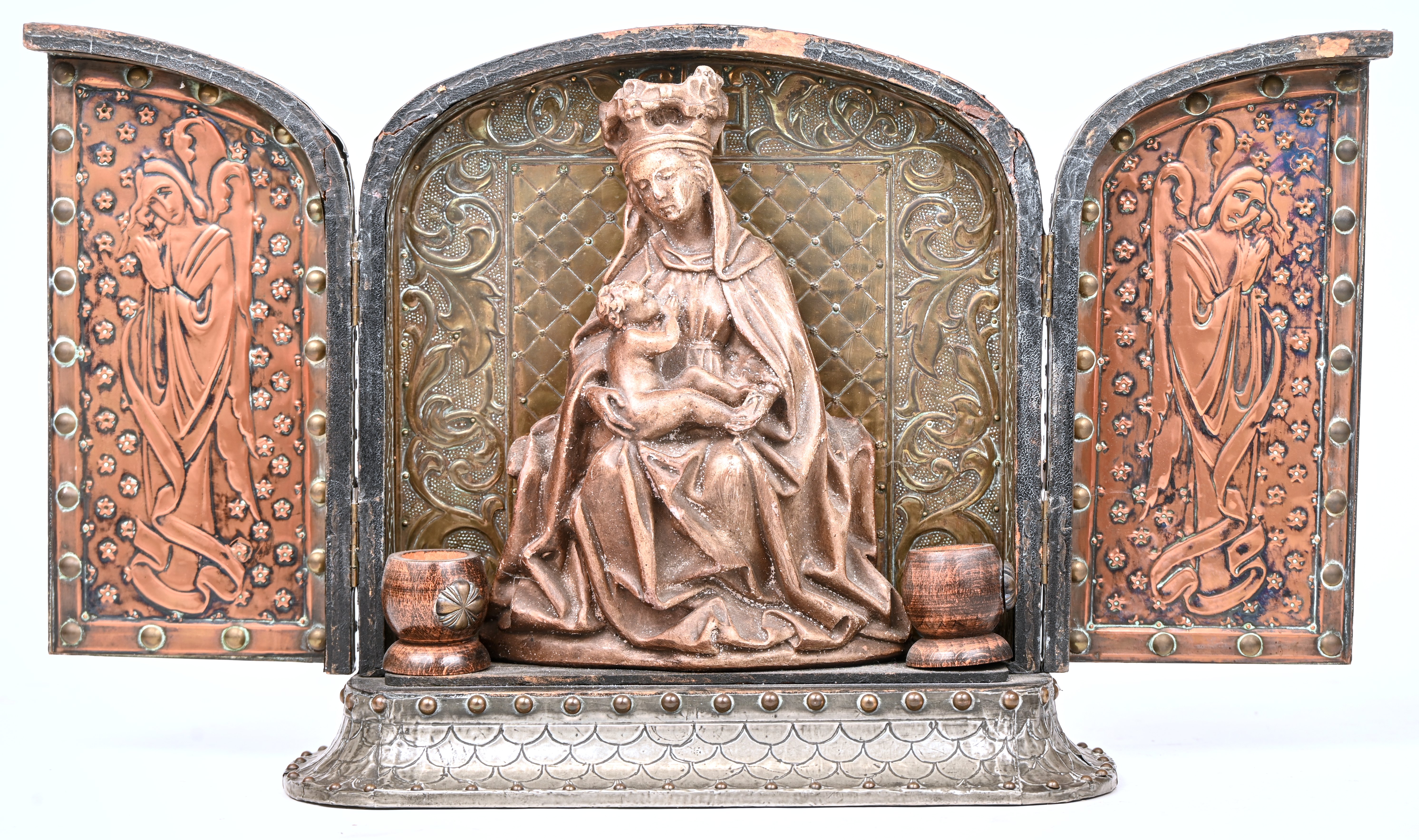 An old religious triptych with a plaster Madonna and child in a wooden cabinet covered with copper and tin. In the style of Alfred Louis Achille Daguet. Circa 1900.