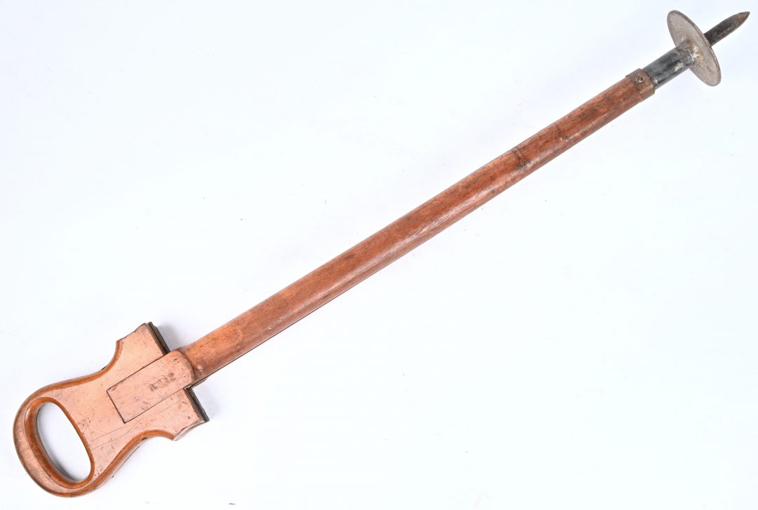 An aluminum and leather walking stick, foldable into a stool. -