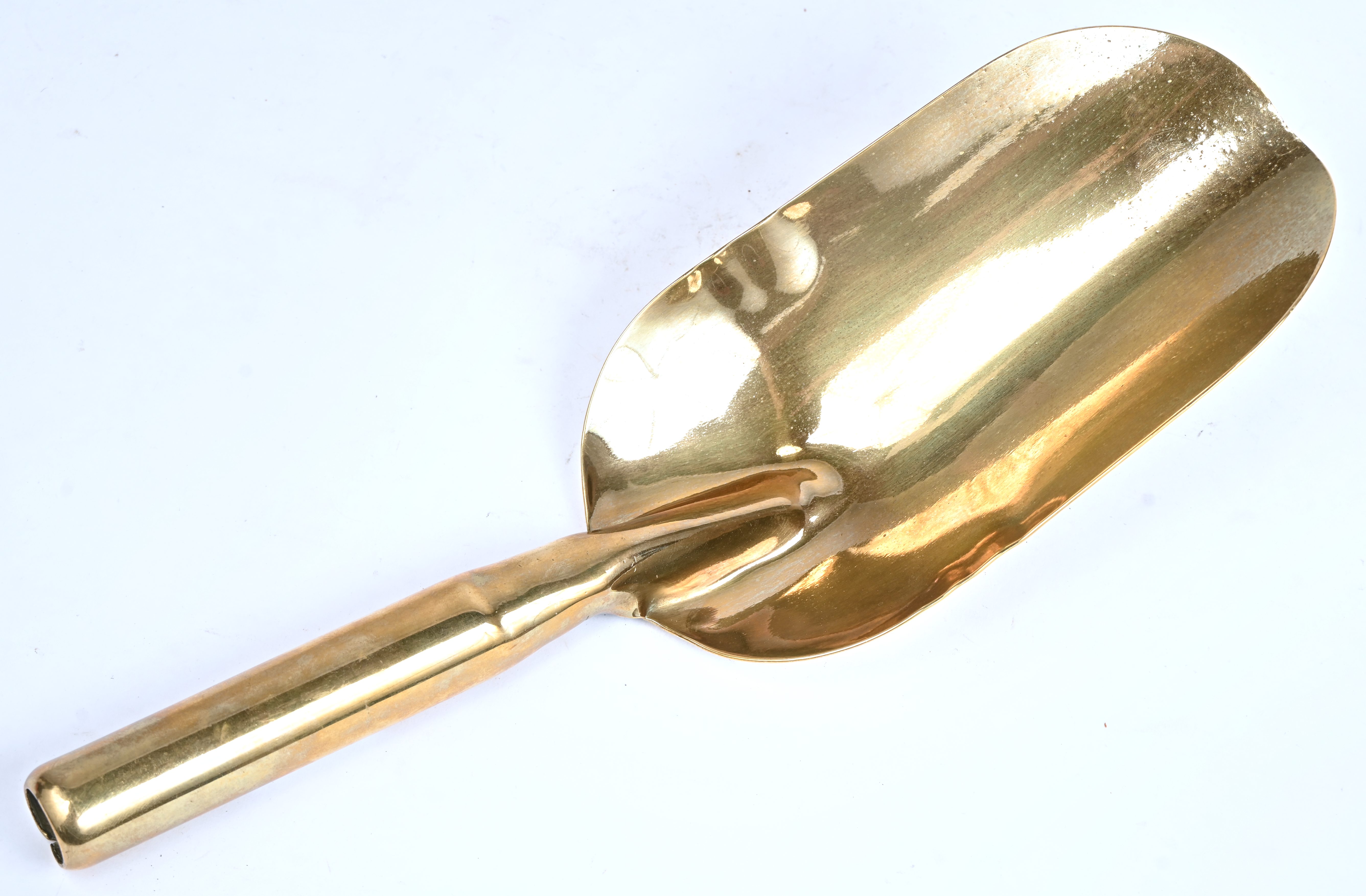 Een oude koperen kolenschep.