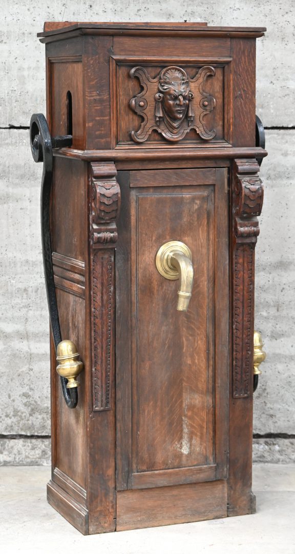 Een oude massief eikenhouten decoratieve pomp gedecoreerd met een Saterhoofd.