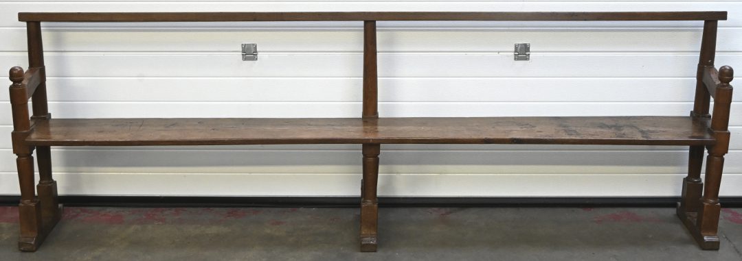 Een oude massief eikenhouten kerkbank, eerste helft 20ste eeuws.