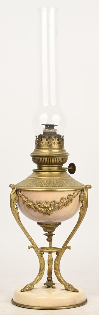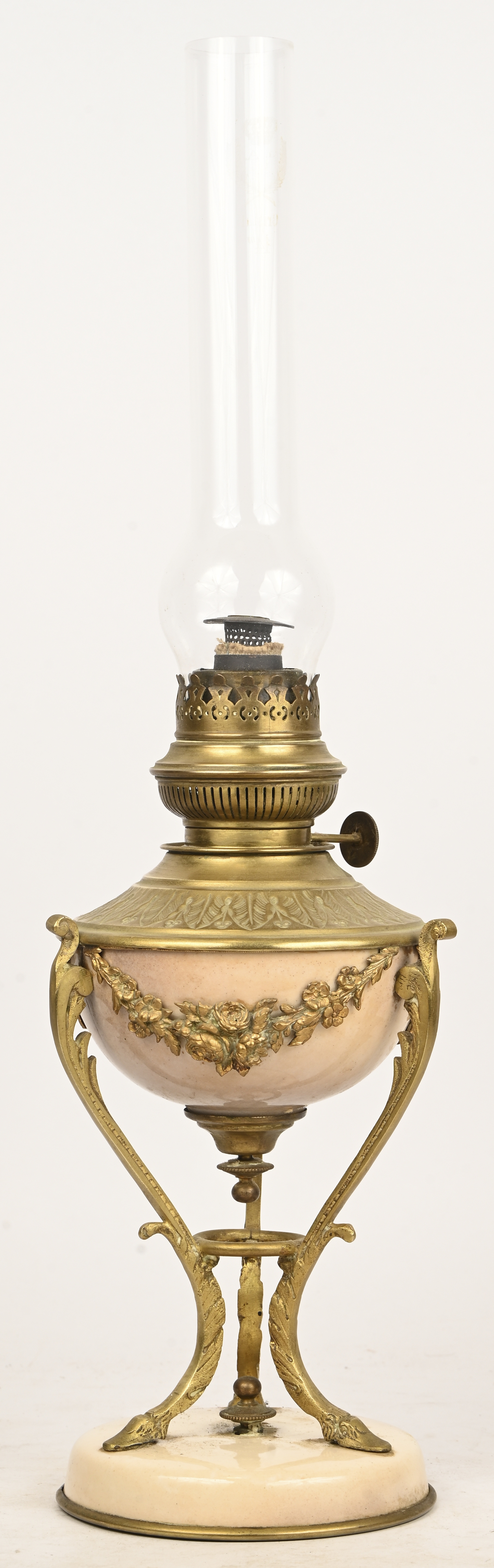 A lot of 4 old oil lamps, accompanied by a silver-plated metal candle holder with a glass hurricane, a lidded pot, and a chrome metal pump. -