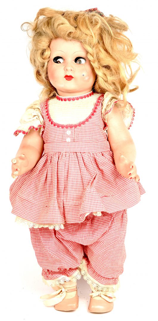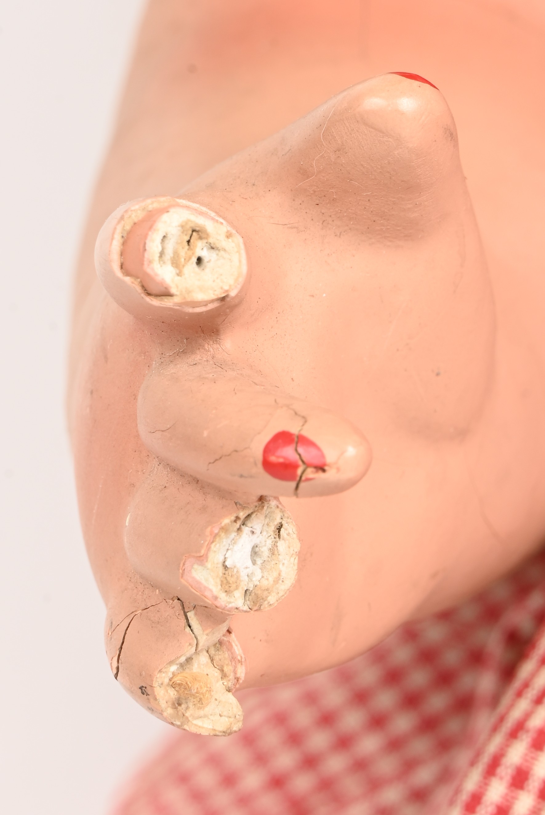 Een oude pop van papier-maché gemerkt Alberani, Milano, Italy. 3 vingers manco, een barst in het aangezicht en arm alsook afschilferende verf. Ca. 1930.