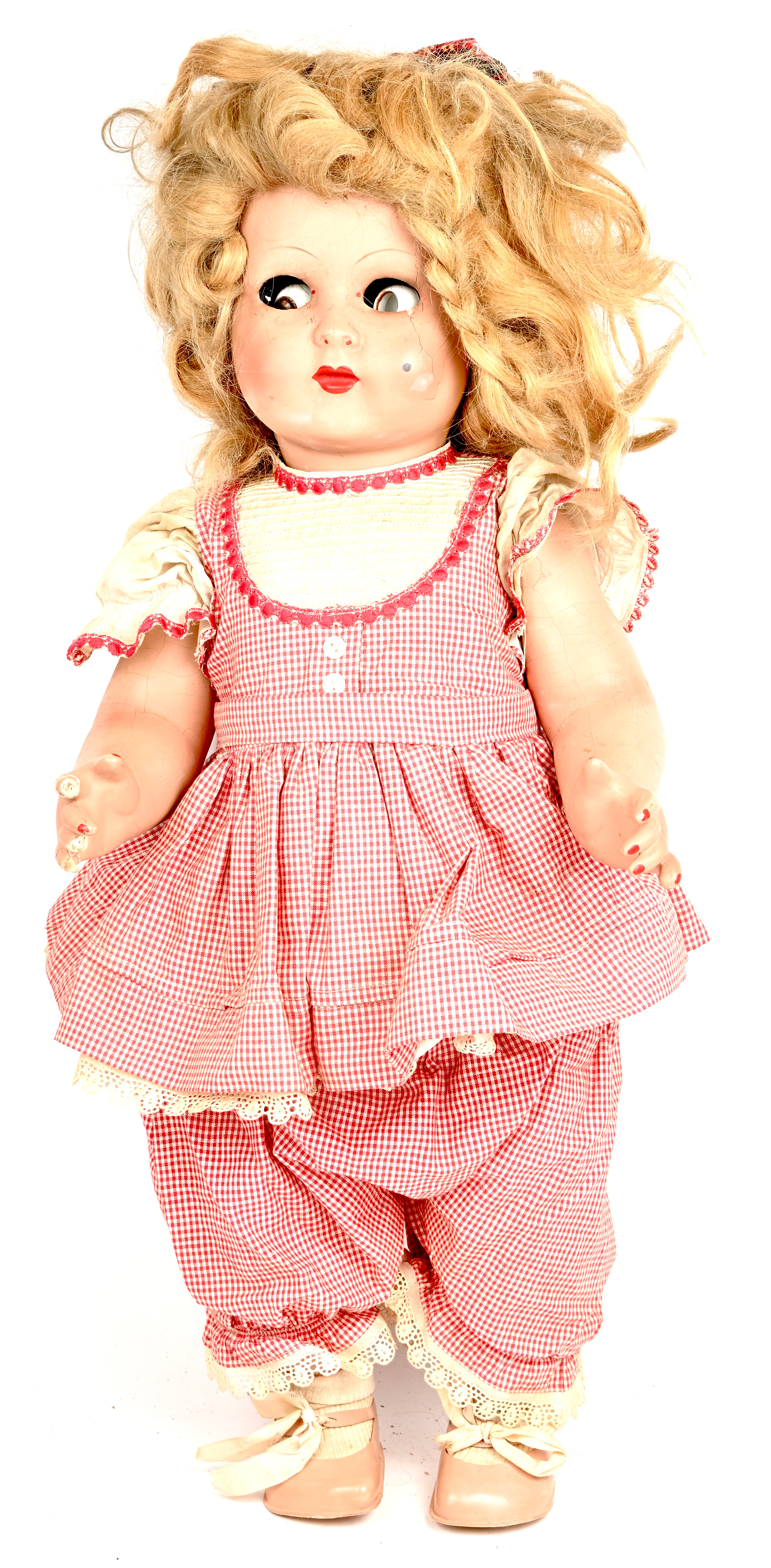 An old papier-mâché doll marked Alberani, Milano, Italy. 3 missing fingers, a crack on the face and arm, as well as peeling paint. Circa 1930.