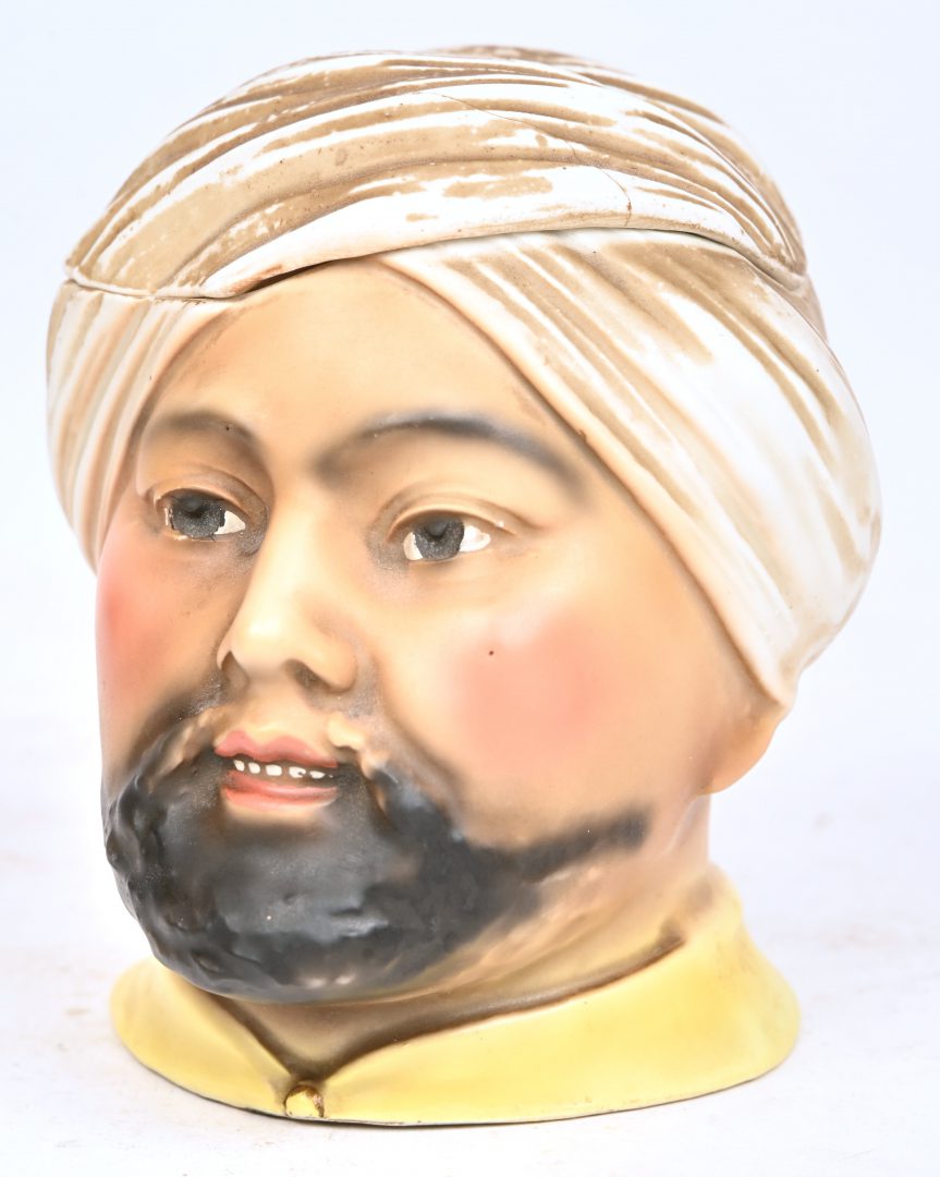 An African tobacco jar made of black patinated wood. Shaped like a sitting man with a dog on his head. -