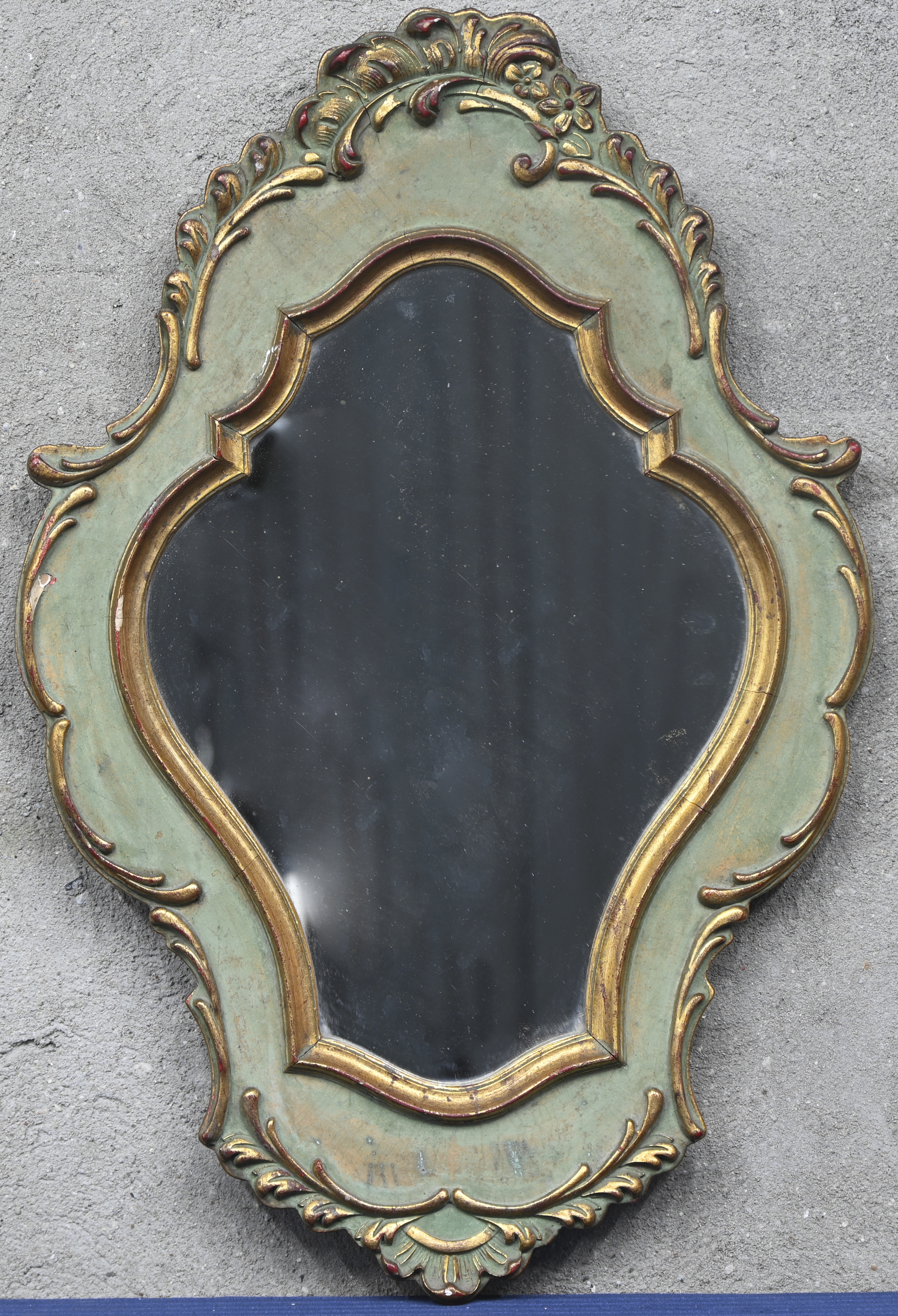 Een oude spiegel in groen- en goud gepatineerde kader.