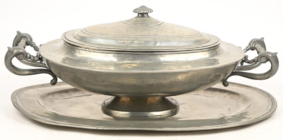 An old pewter tureen on a platter with a total weight of 6980 grams.
