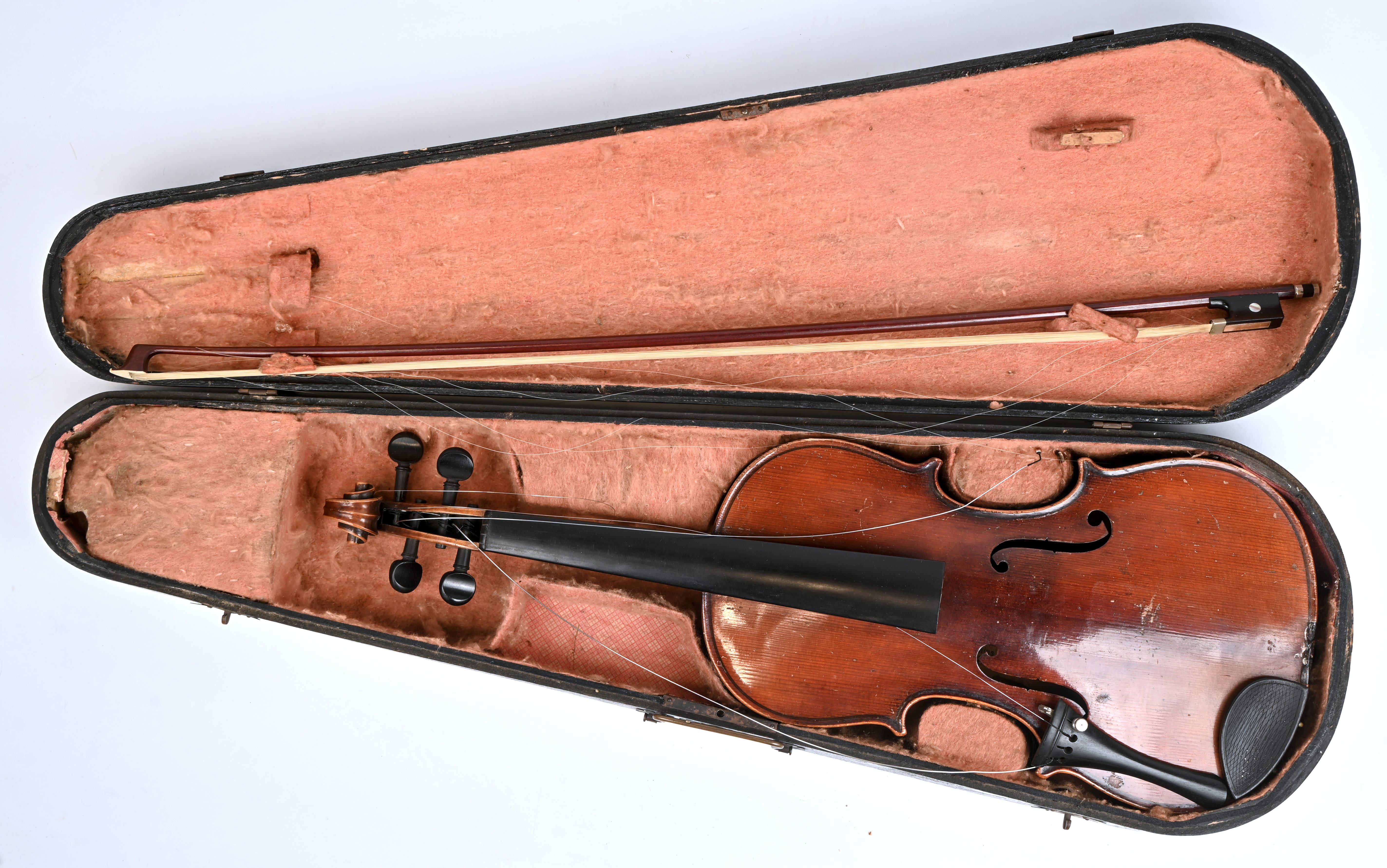 An old violin in case, marked Stradivarius. To be restored.