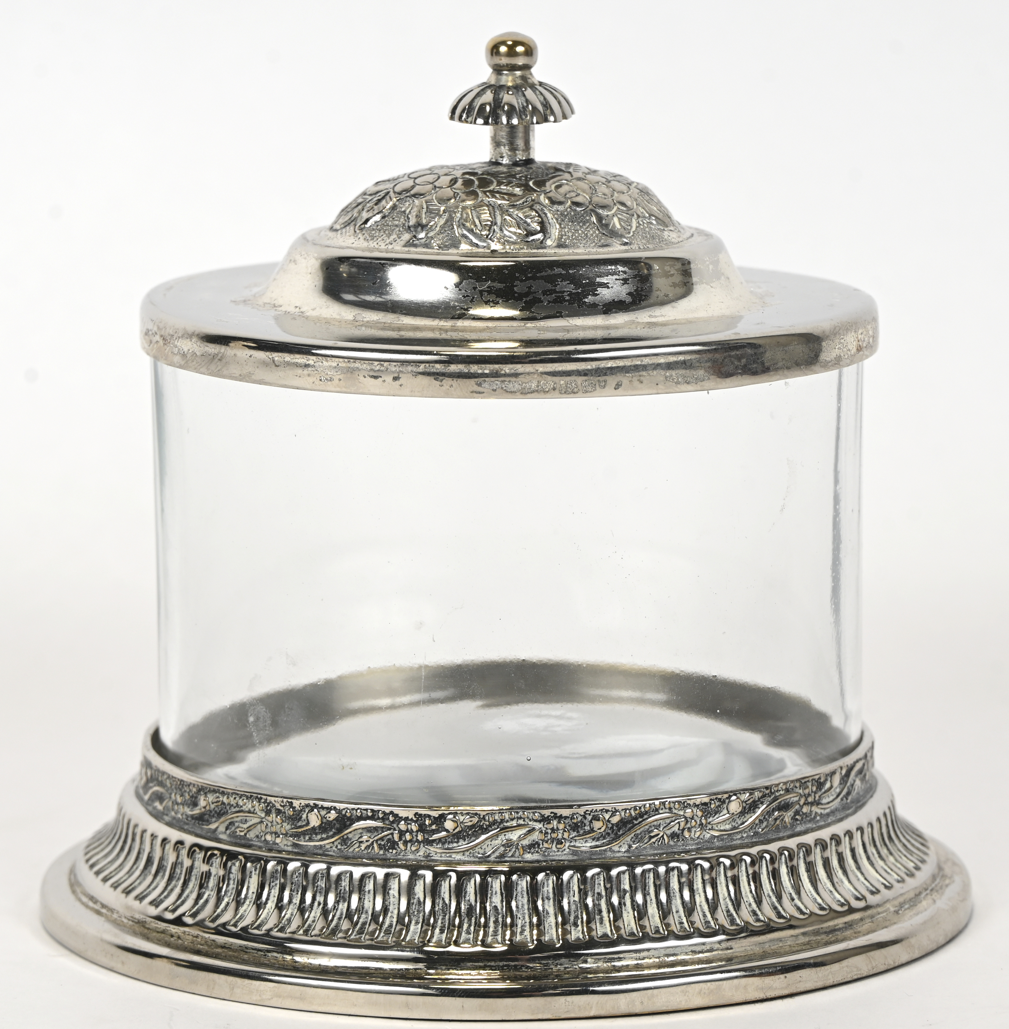 Een ovale bonbonnière van glas en verzilverd metaal. Deksel met een gedreven bladmotief. KS