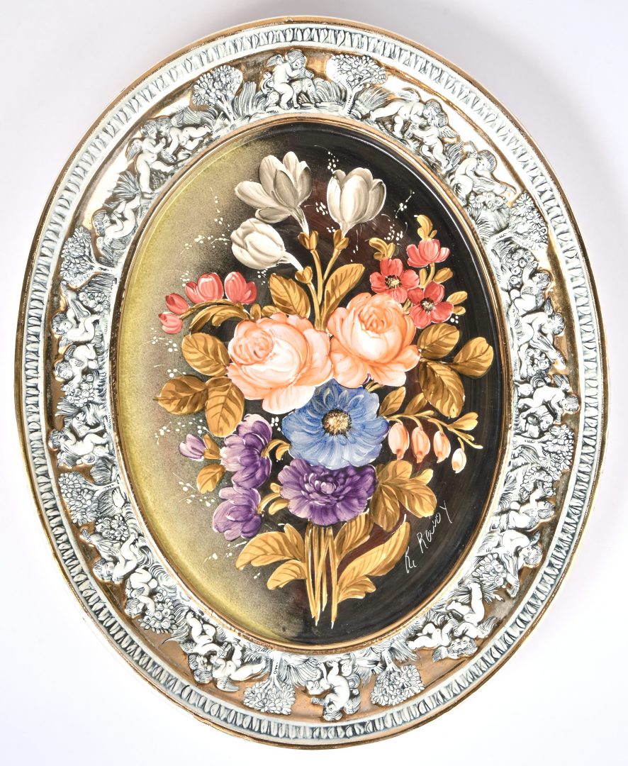An oval porcelain frame with a frieze of angels and, in the center, a floral still life. Marked.