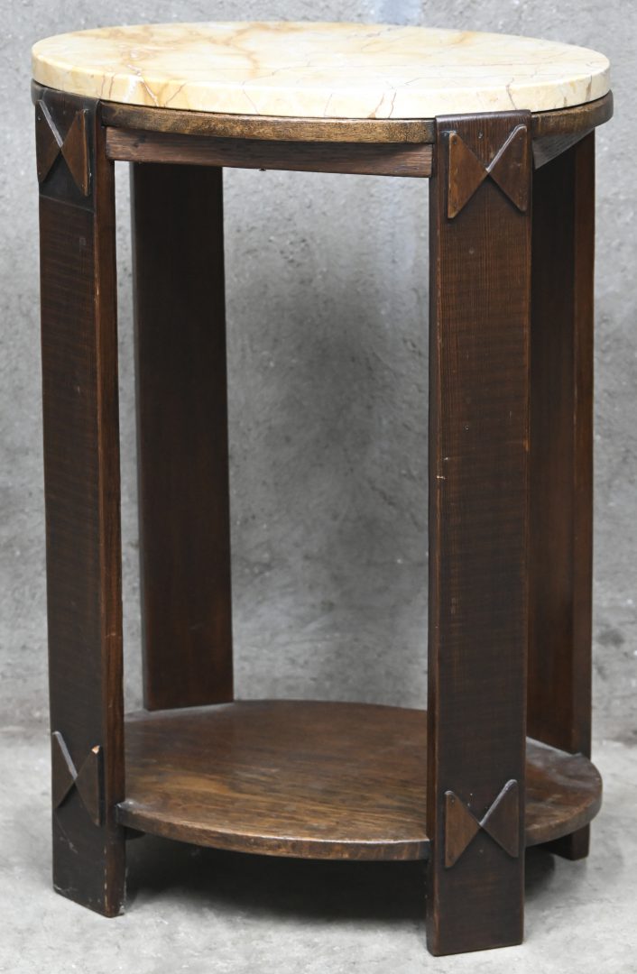 Een gemarquetteerde ronde tafel in Victoriaanse stijl op centrale voet.