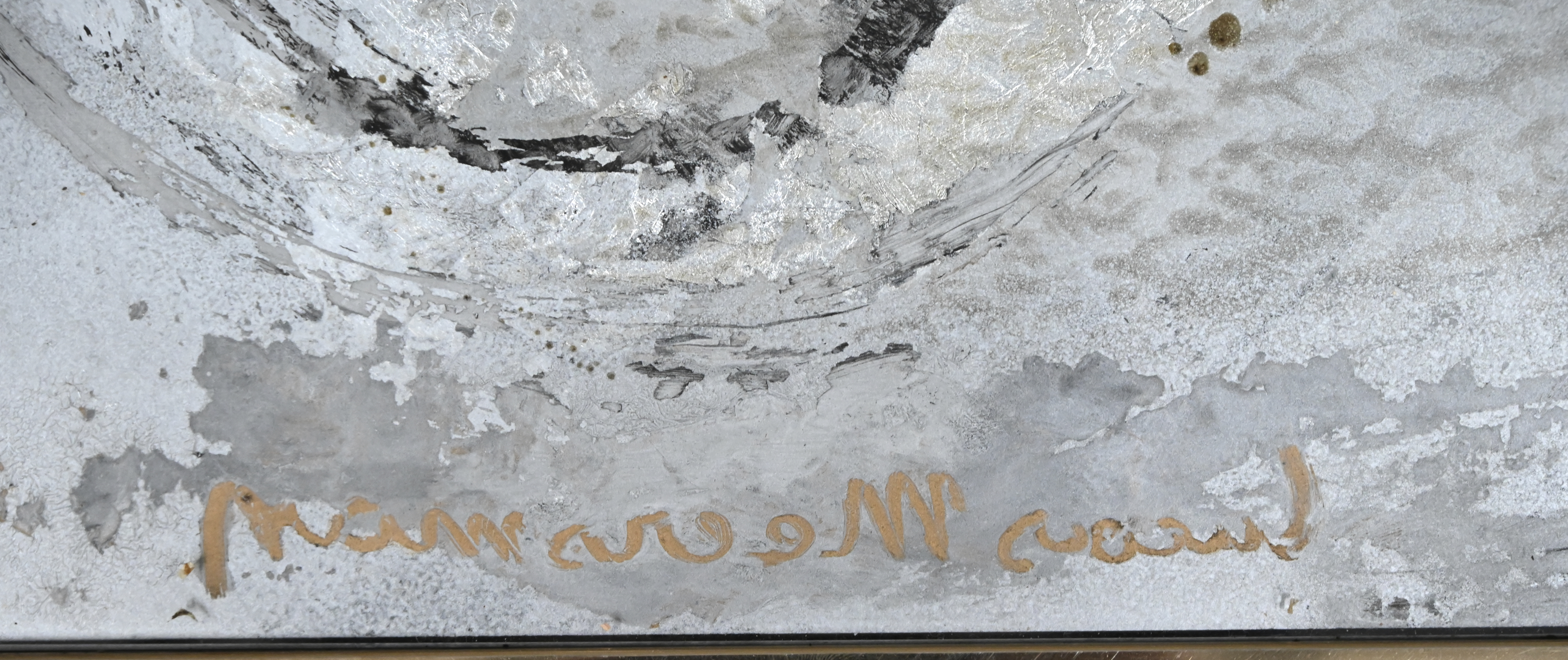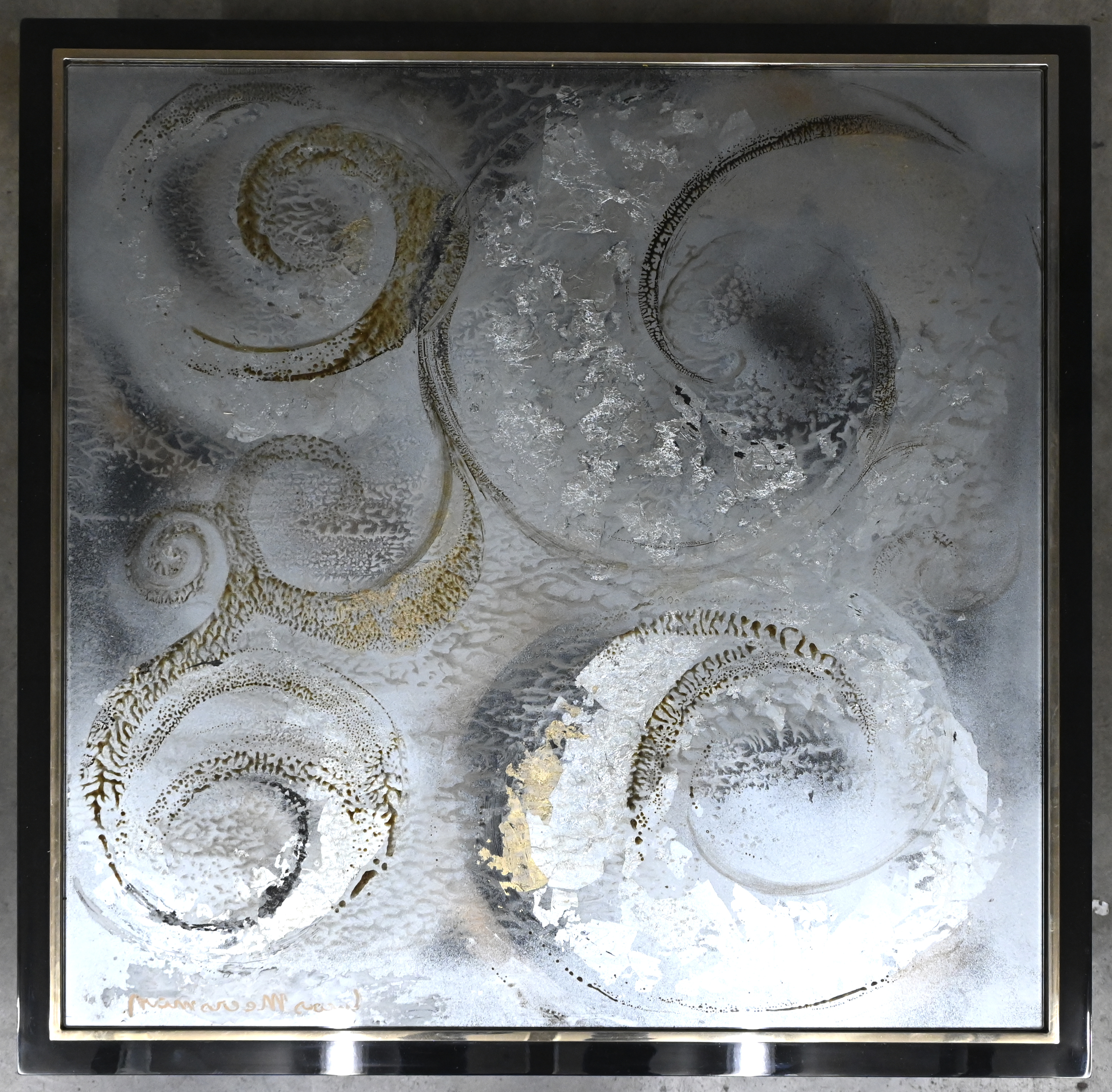 #156Lucas MeersmanPeriod: °1938 - ....Een modernistische vierkante salontafel, het blad met een abstracte schildering in églomisé, gesigneerd.