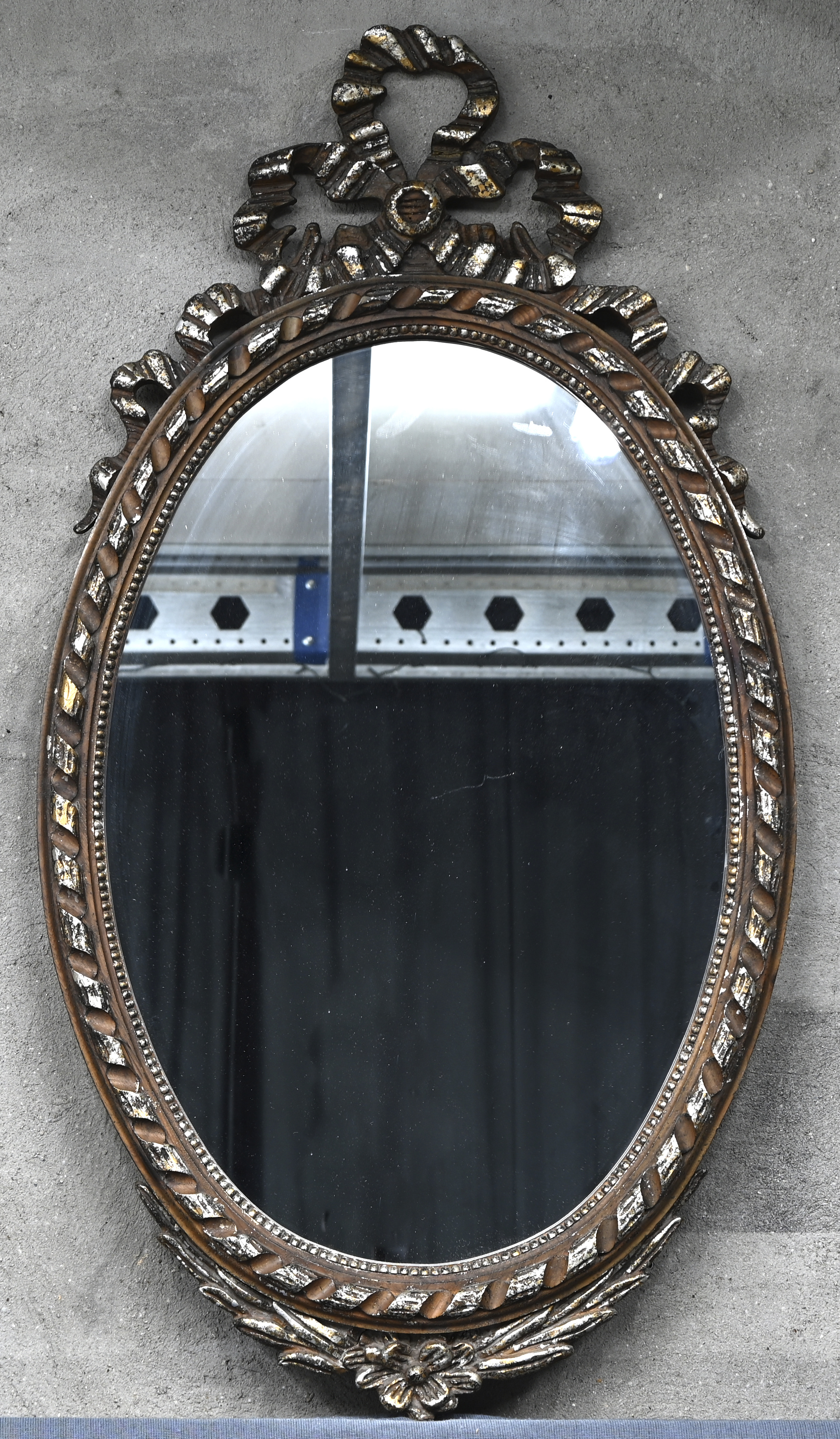 #312Een spiegel in vergulde kader gedecoreerd met een strik en rozen.