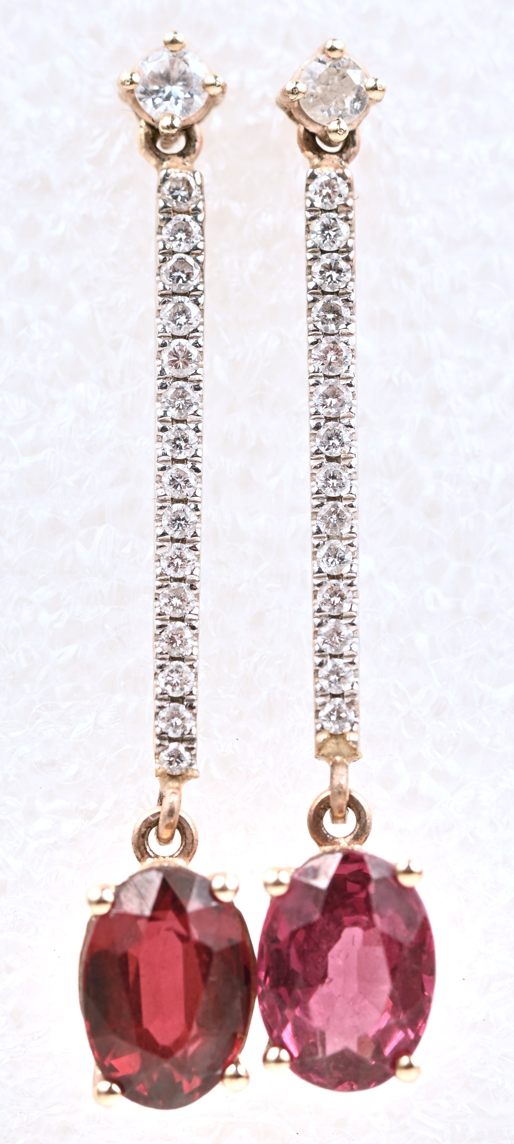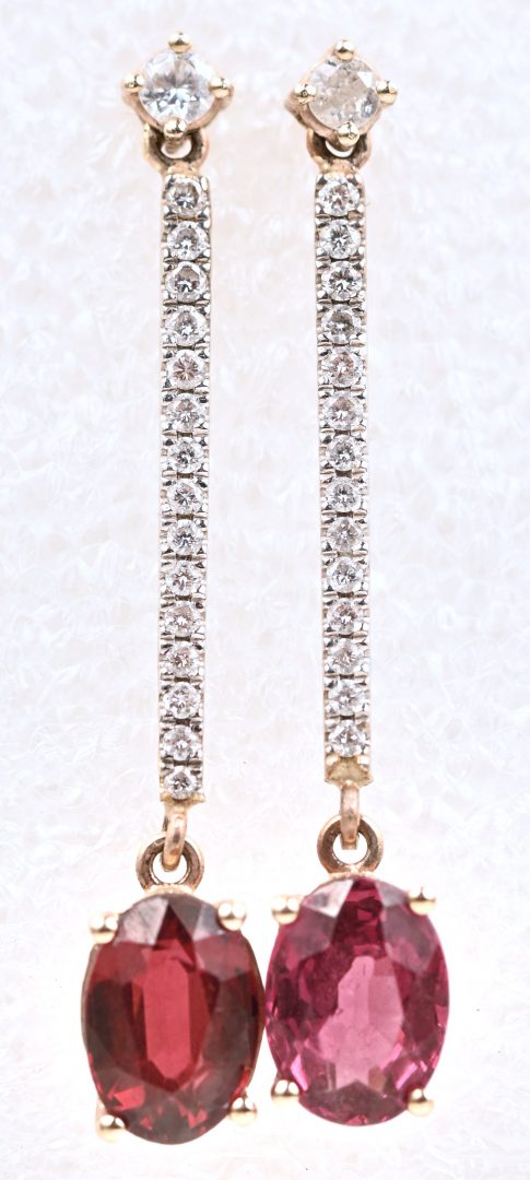 Een paar 18 karaats wit en geelgouden oorbellen bezet met briljanten met een gezamenlijk gewicht van +- 0,34 ct. en twee robijnen met een gezamenlijk gewicht van +- 2 ct.