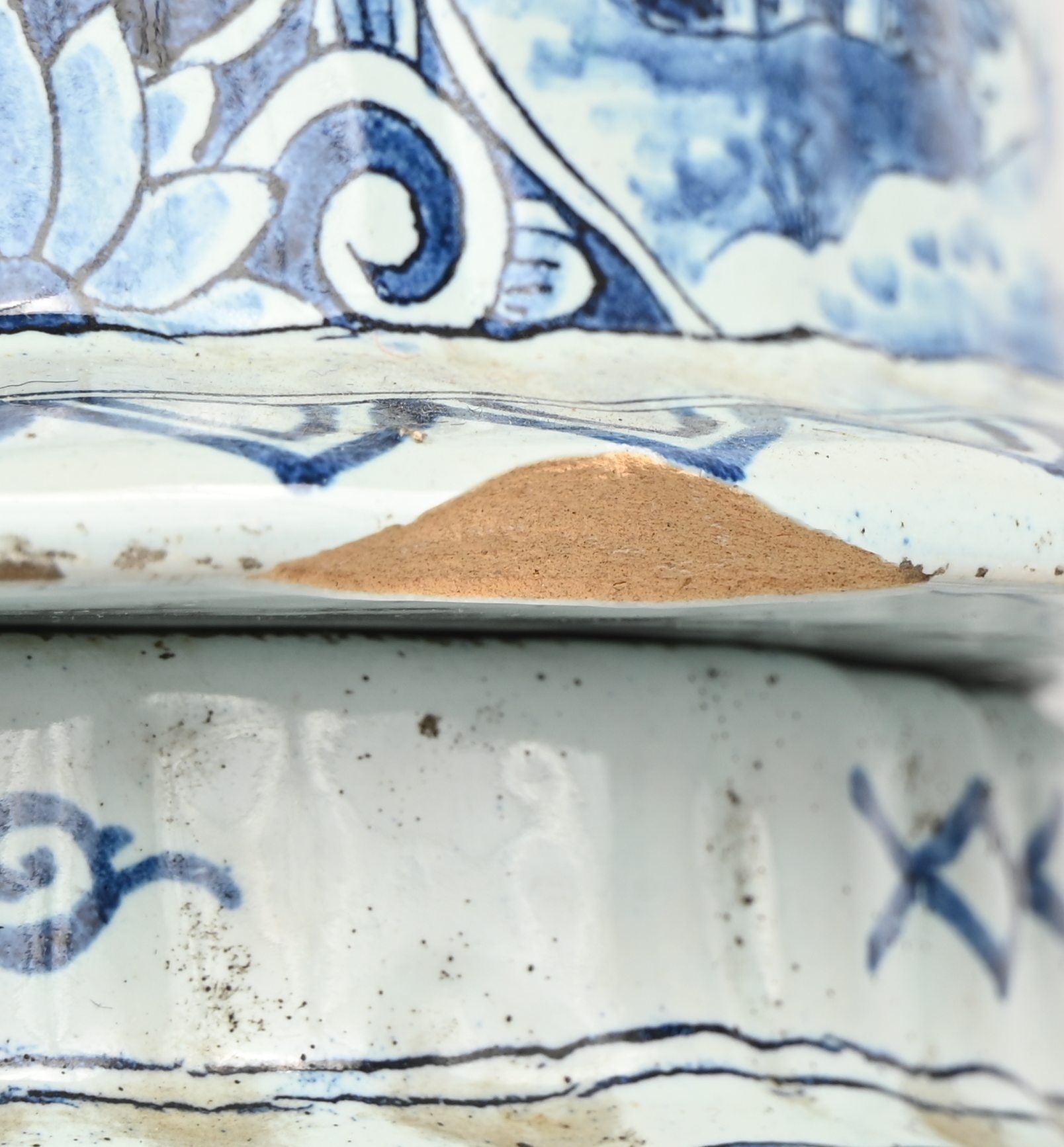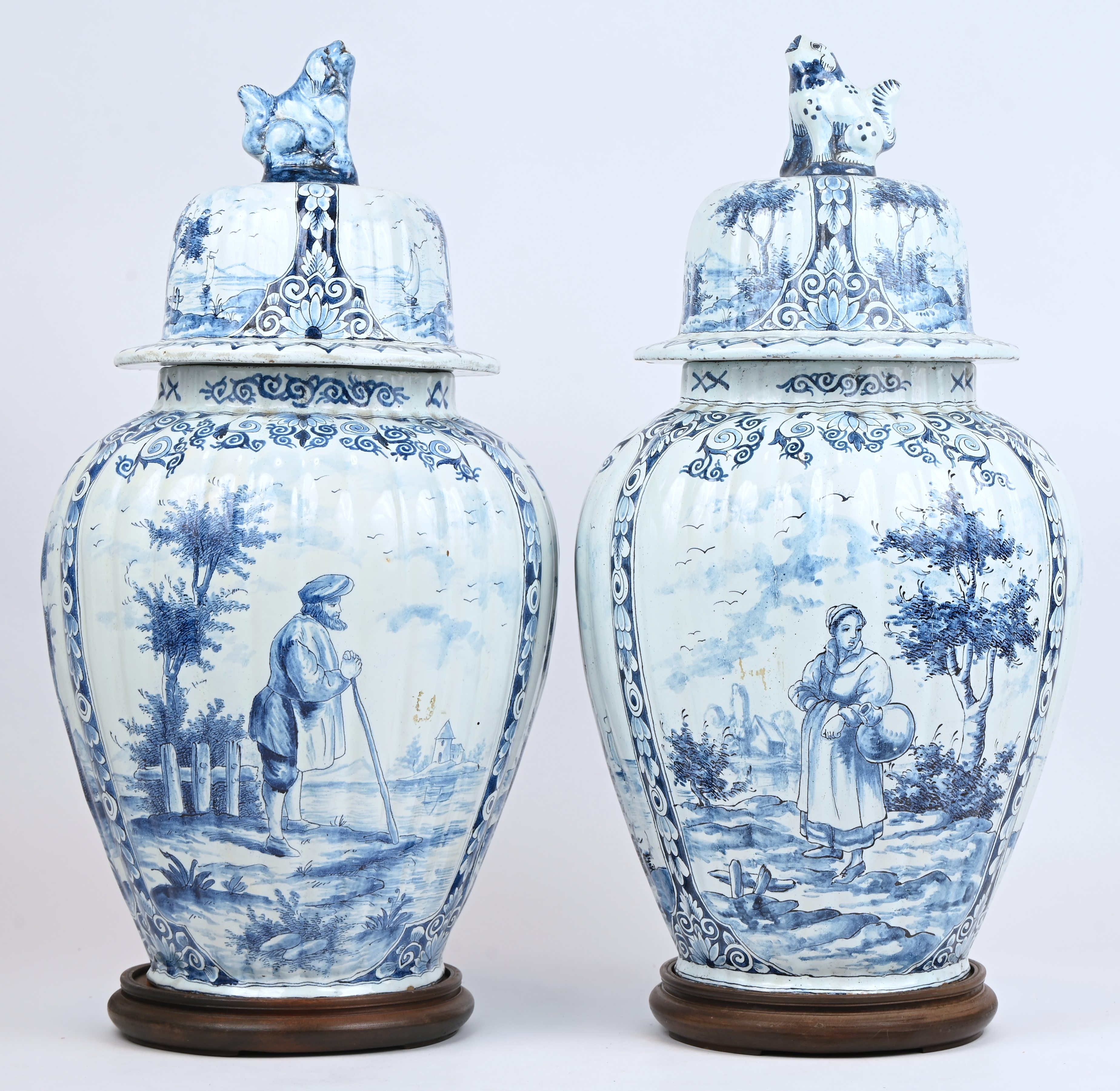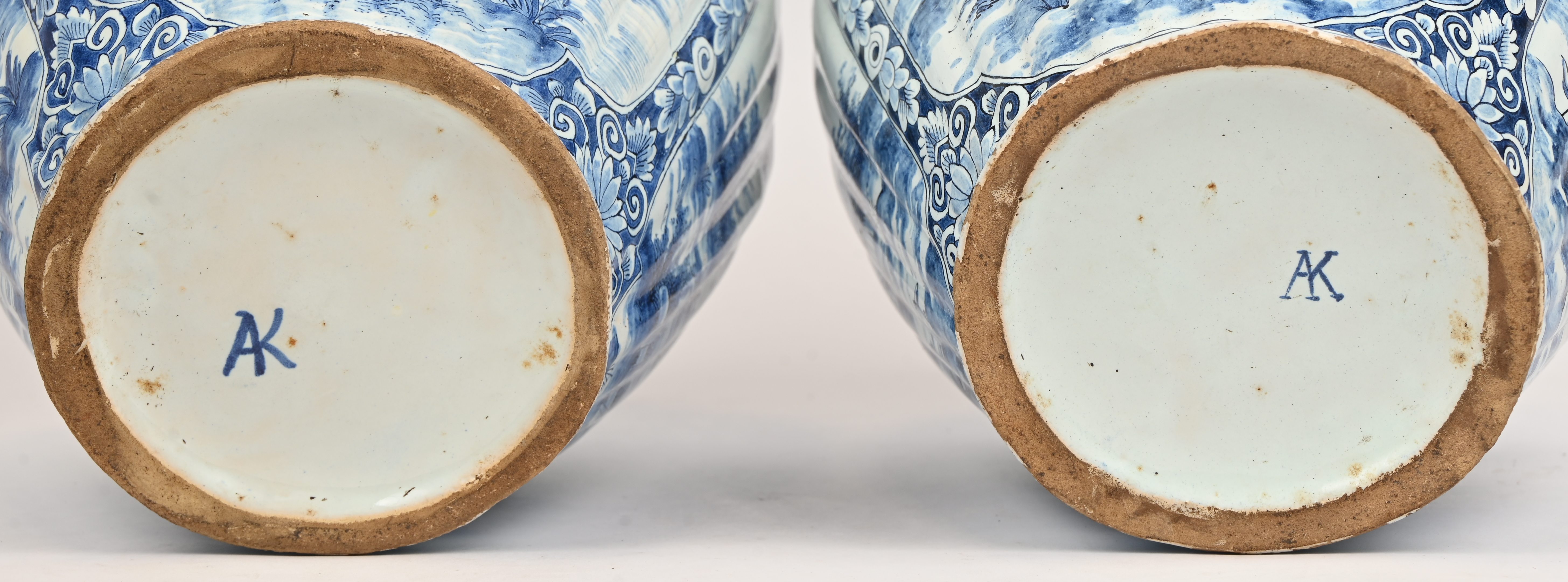 Een paar blauw en witte dekselvazen van Delfts aardewerk. Beide hebben een schilfer. Onderaan gemerkt AK. Met houten sokkel.