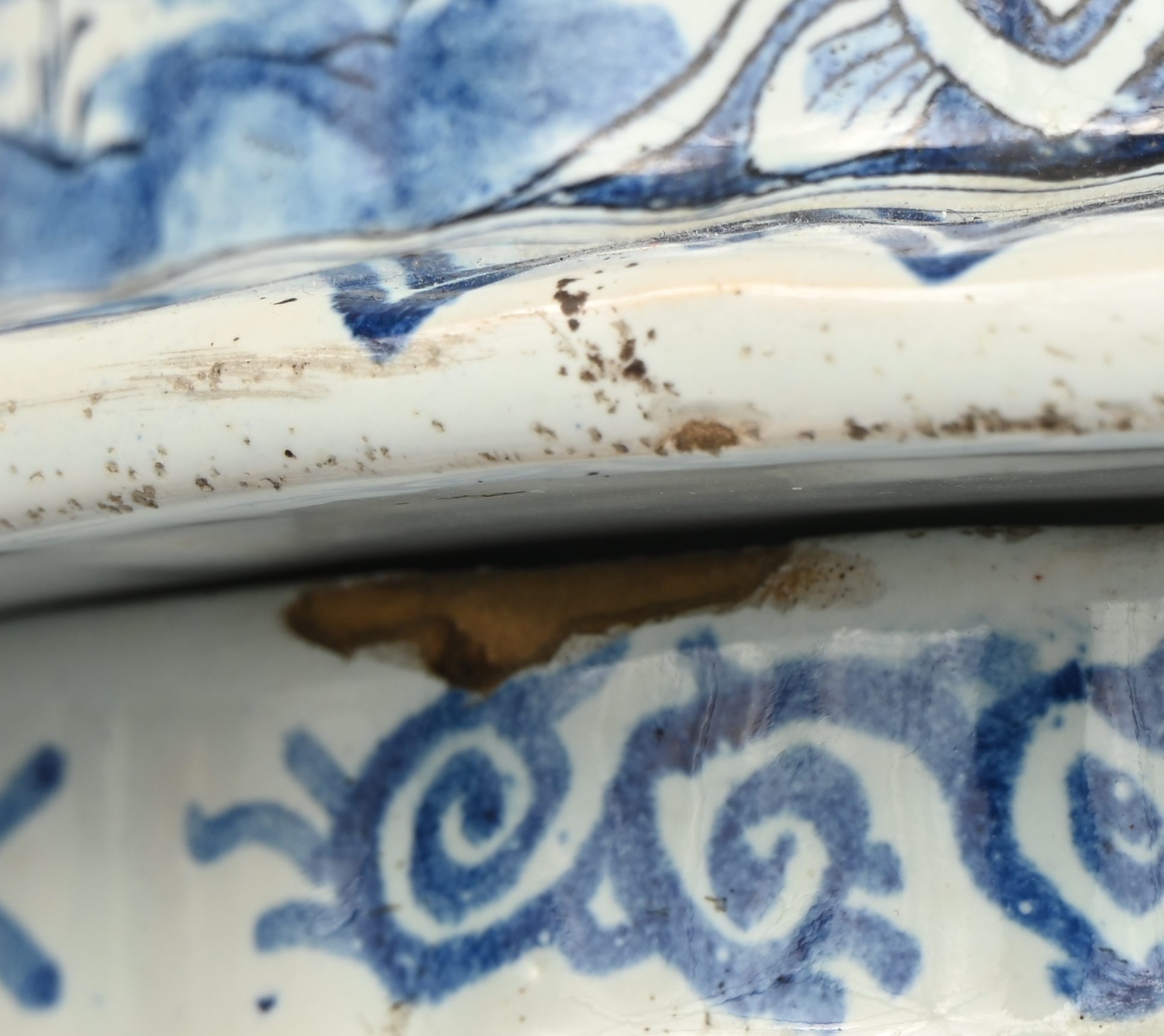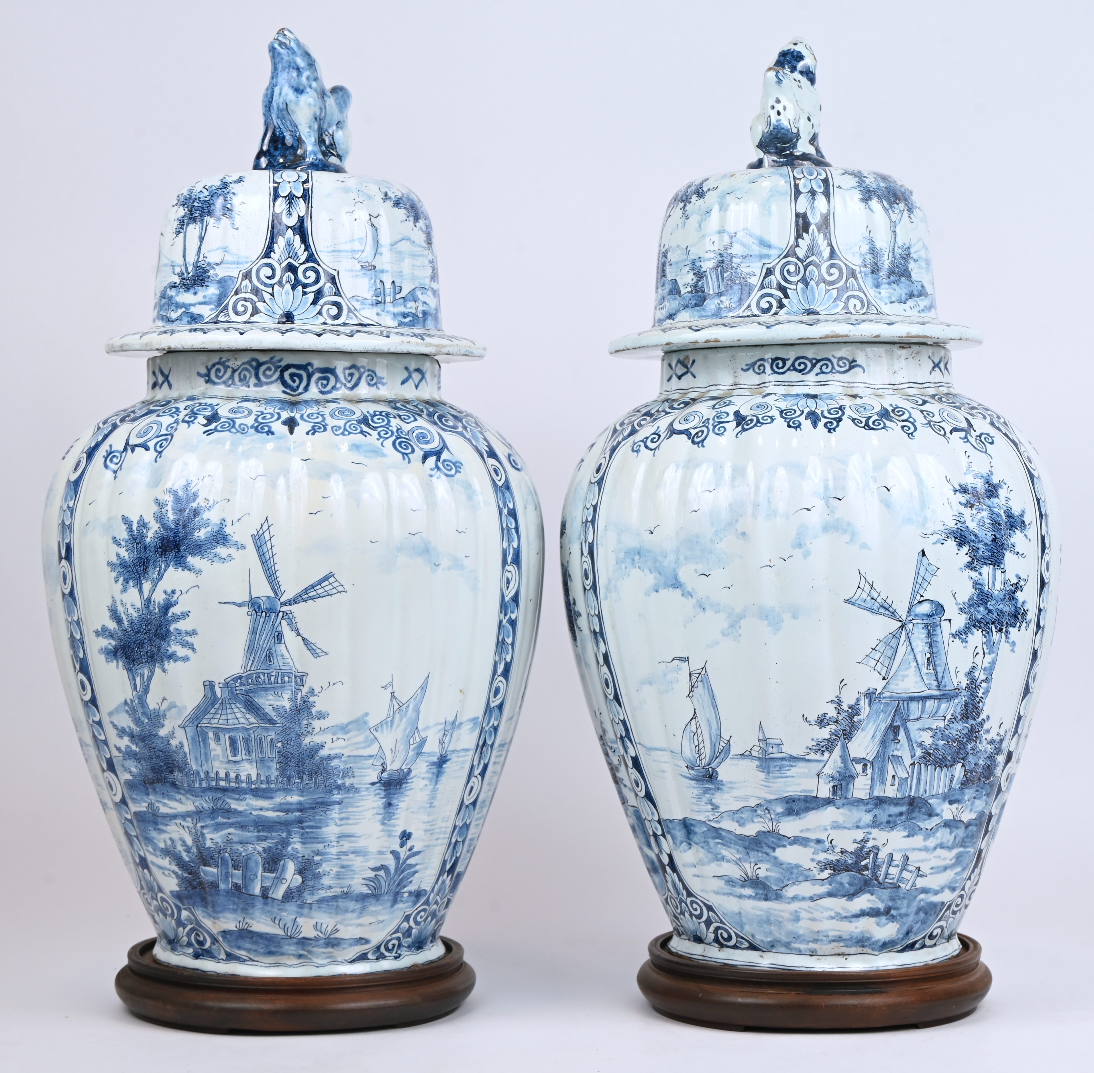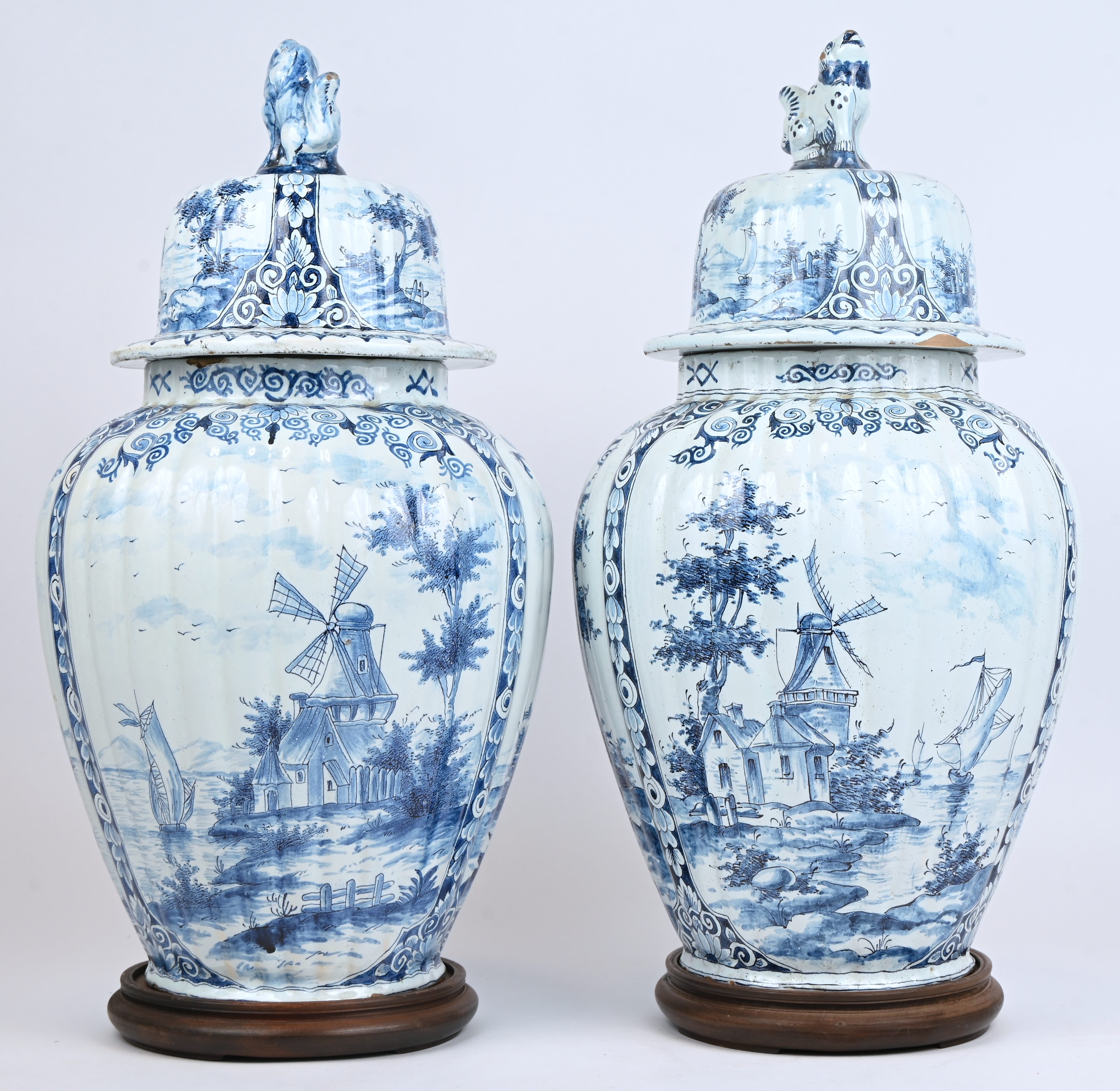 A pair of blue and white lidded vases of Delftware. Both have a chip. Marked AK underneath. With wooden base.