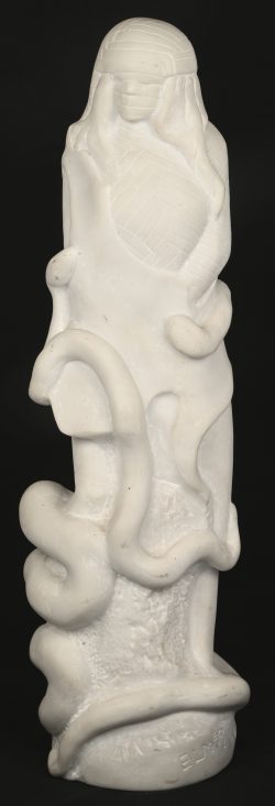 A white marble sculpture of a partially mummified woman surrounded by snakes. Signed Elmer. -